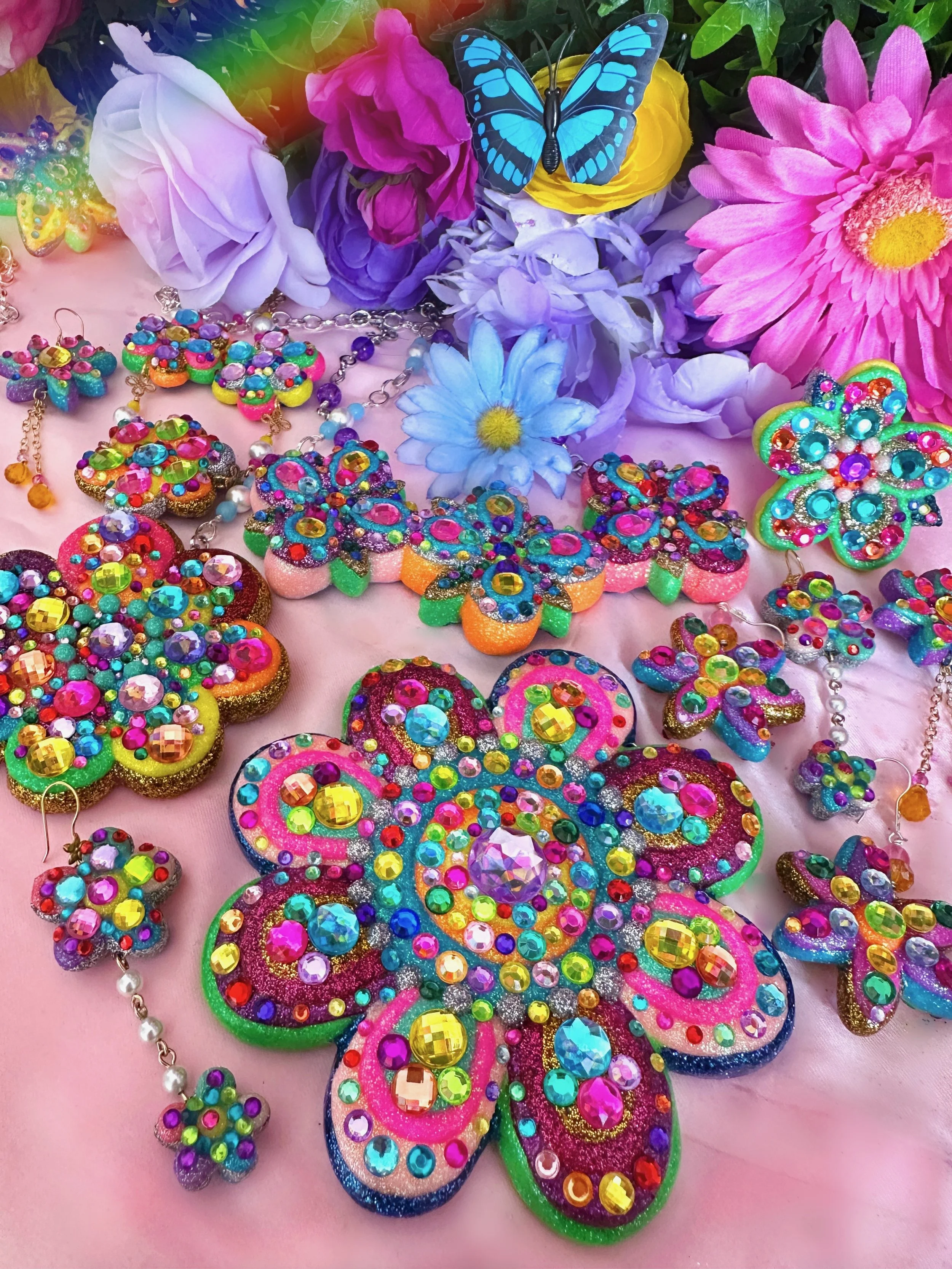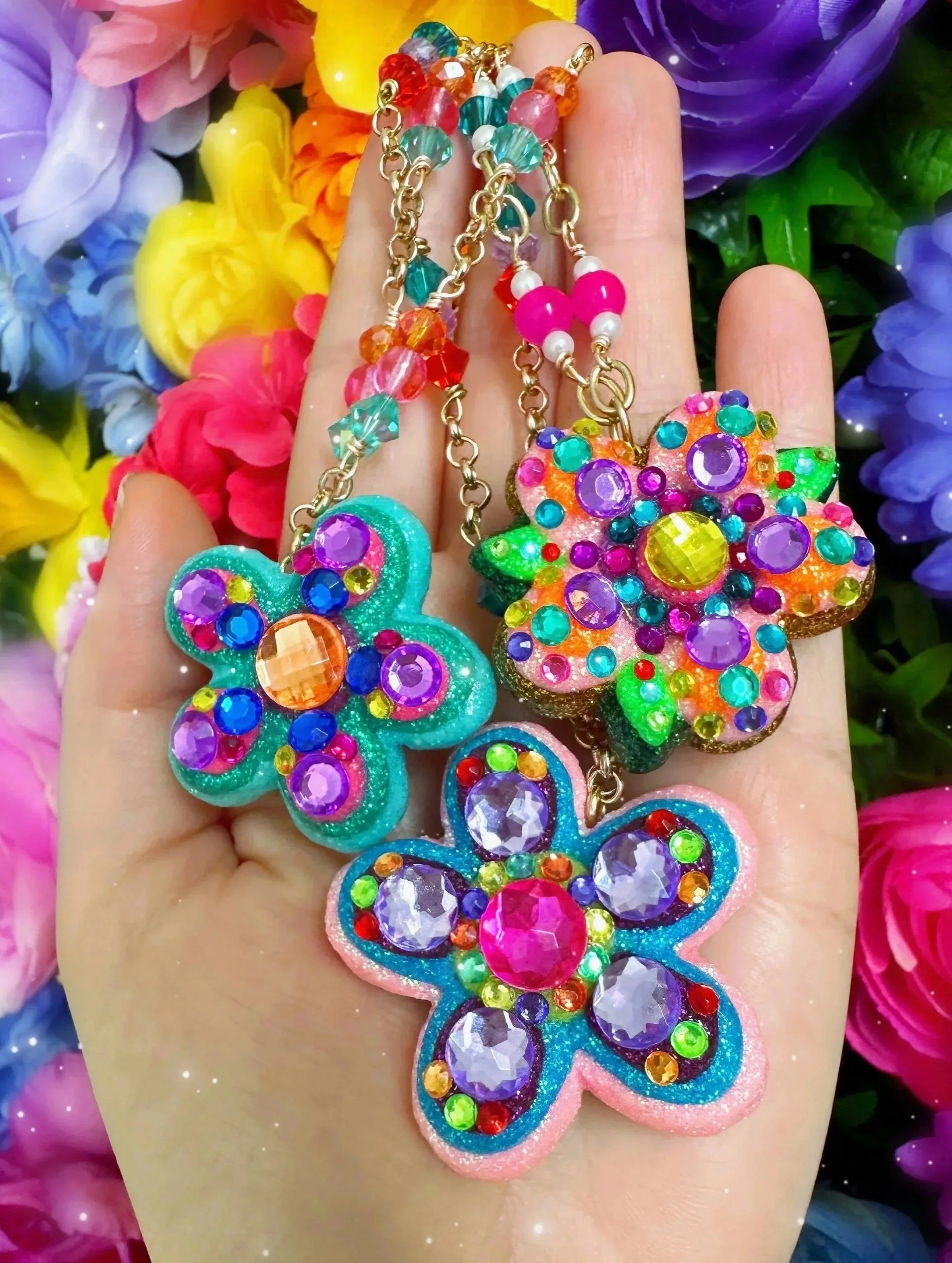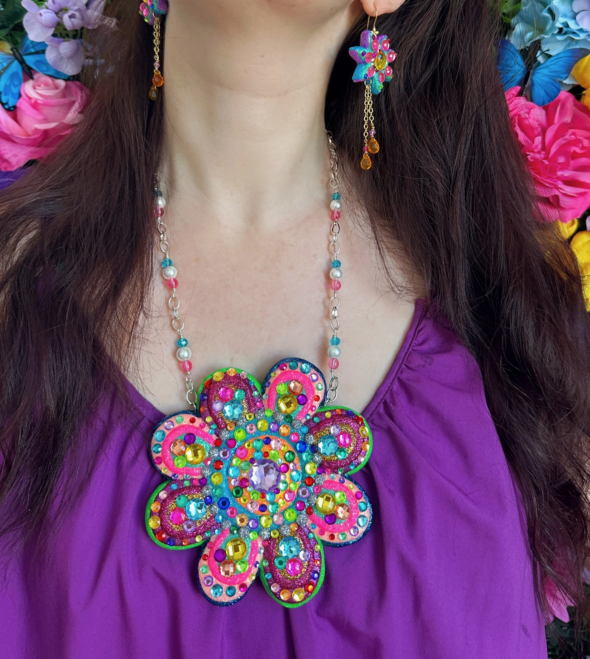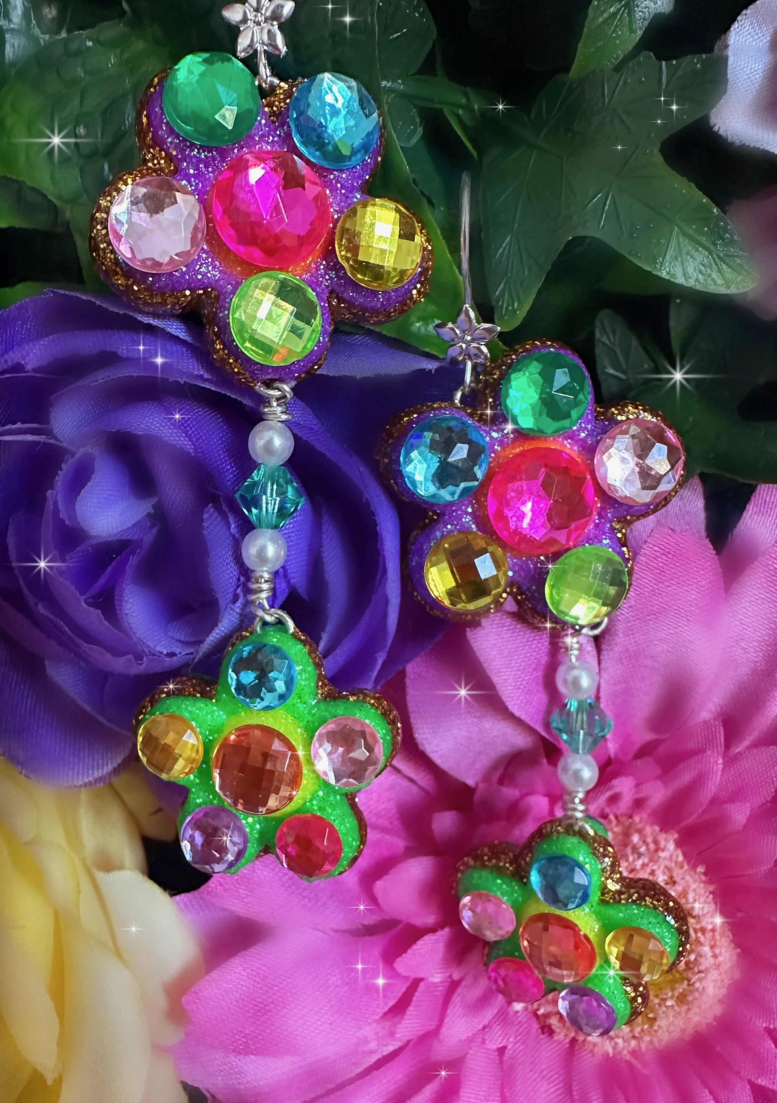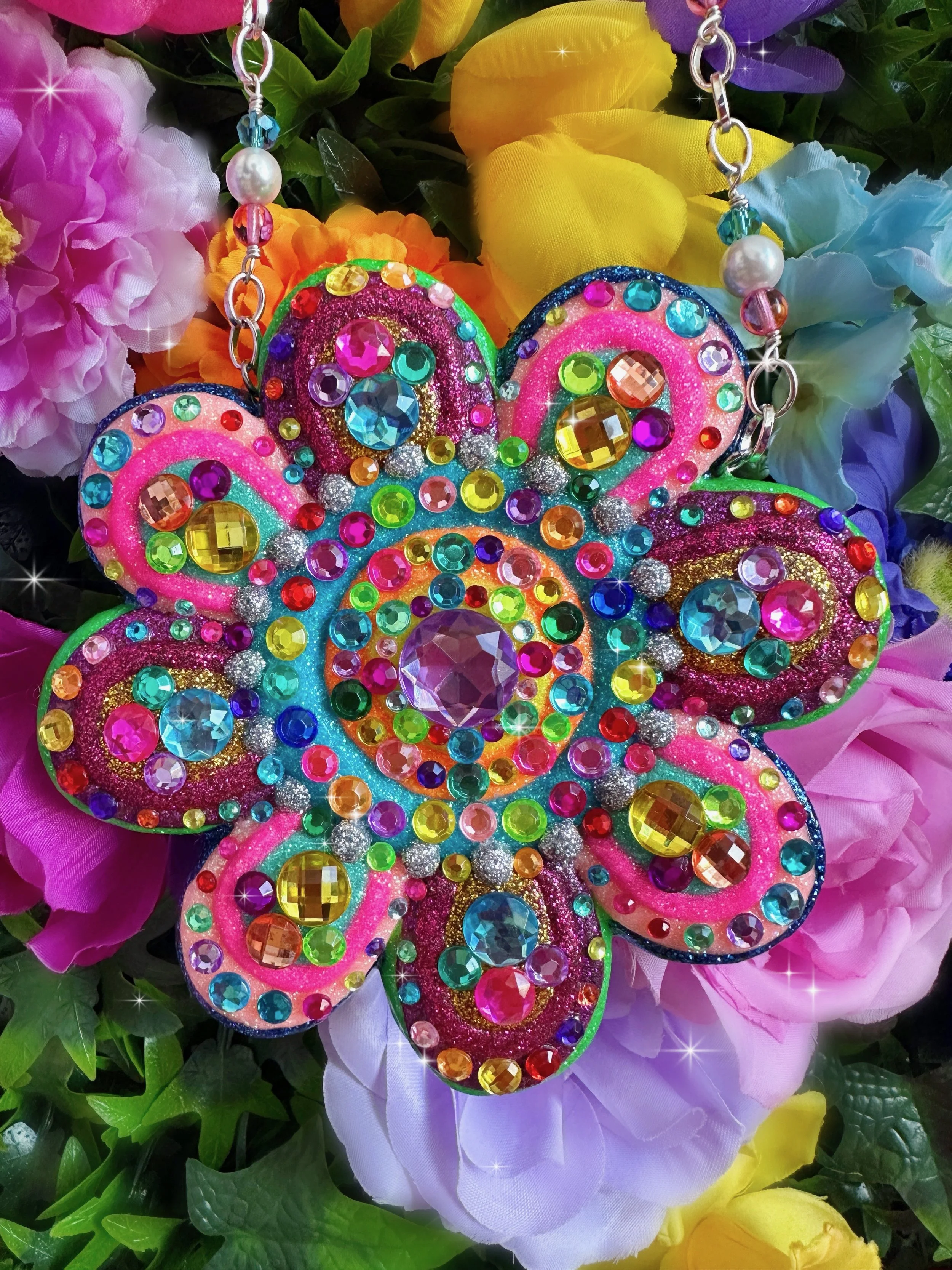 Glistening new flower necklaces and earrings are ready to adorn you with all the sparkly flower fairy magic! These flowers are full of endless rainbows, glittering fairy dust, the most colorful rhinestones and shimmering crystals, gemstones and pearls to brighten up your day and keep you sparkling everywhere you go! I hope these flowers bring you lots of joy and sunshine and remind you how bright and sparkly you truly are!