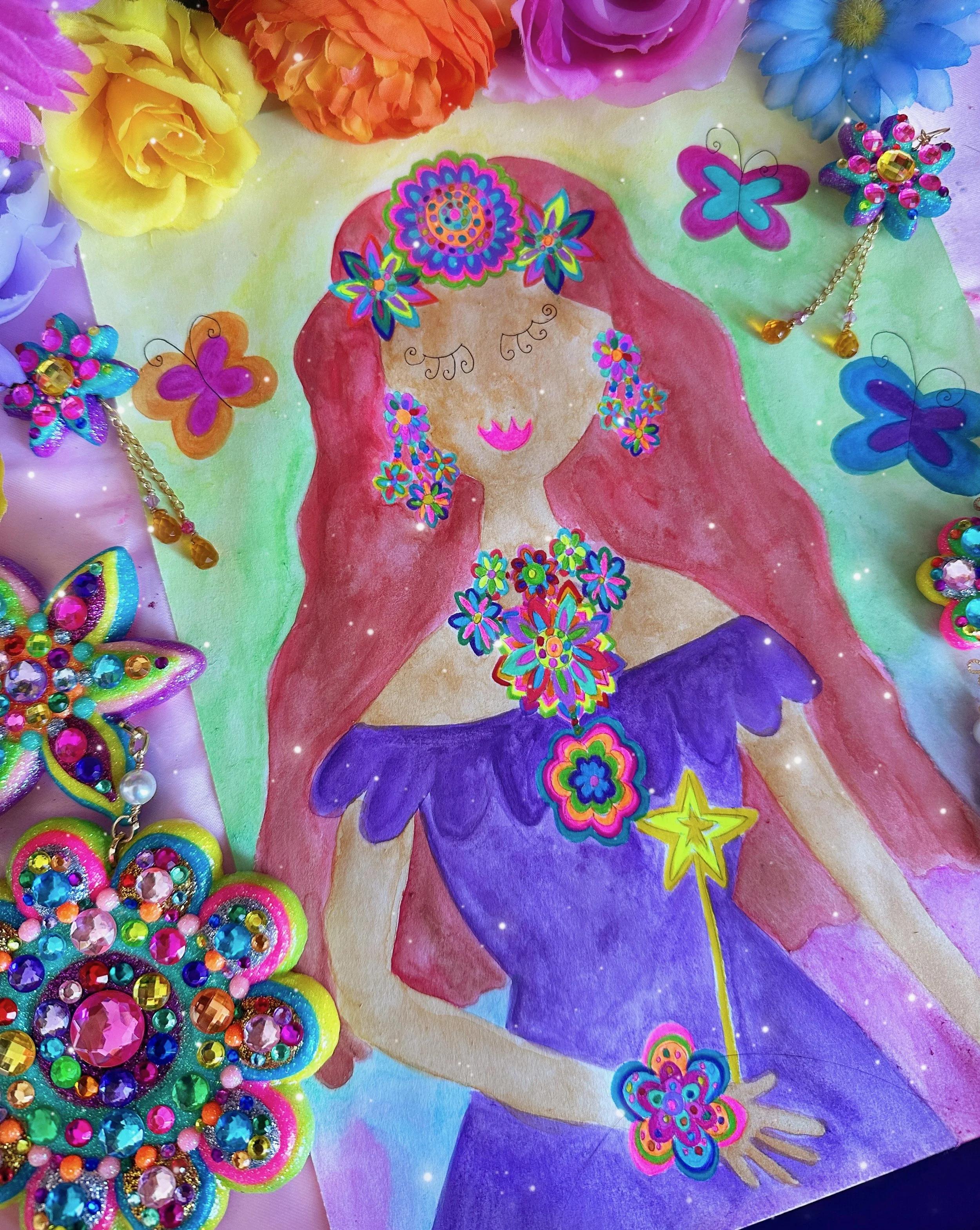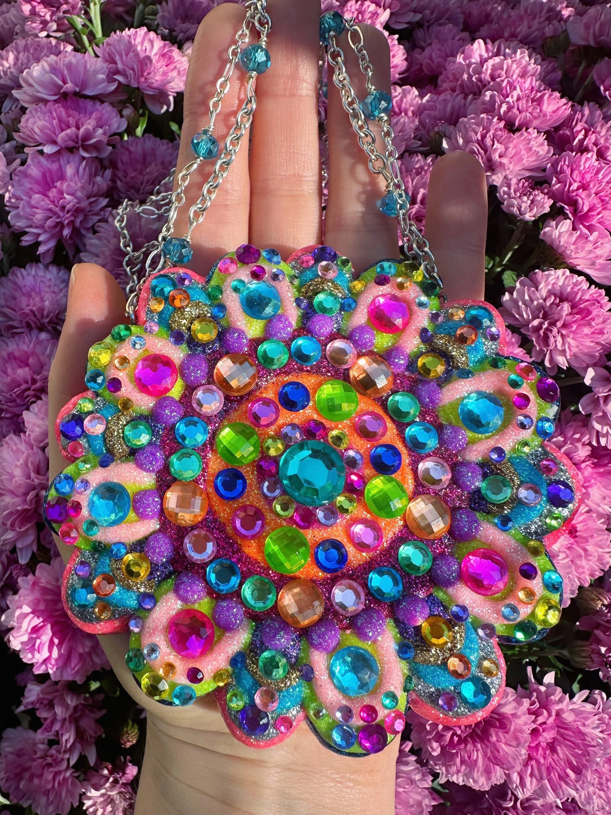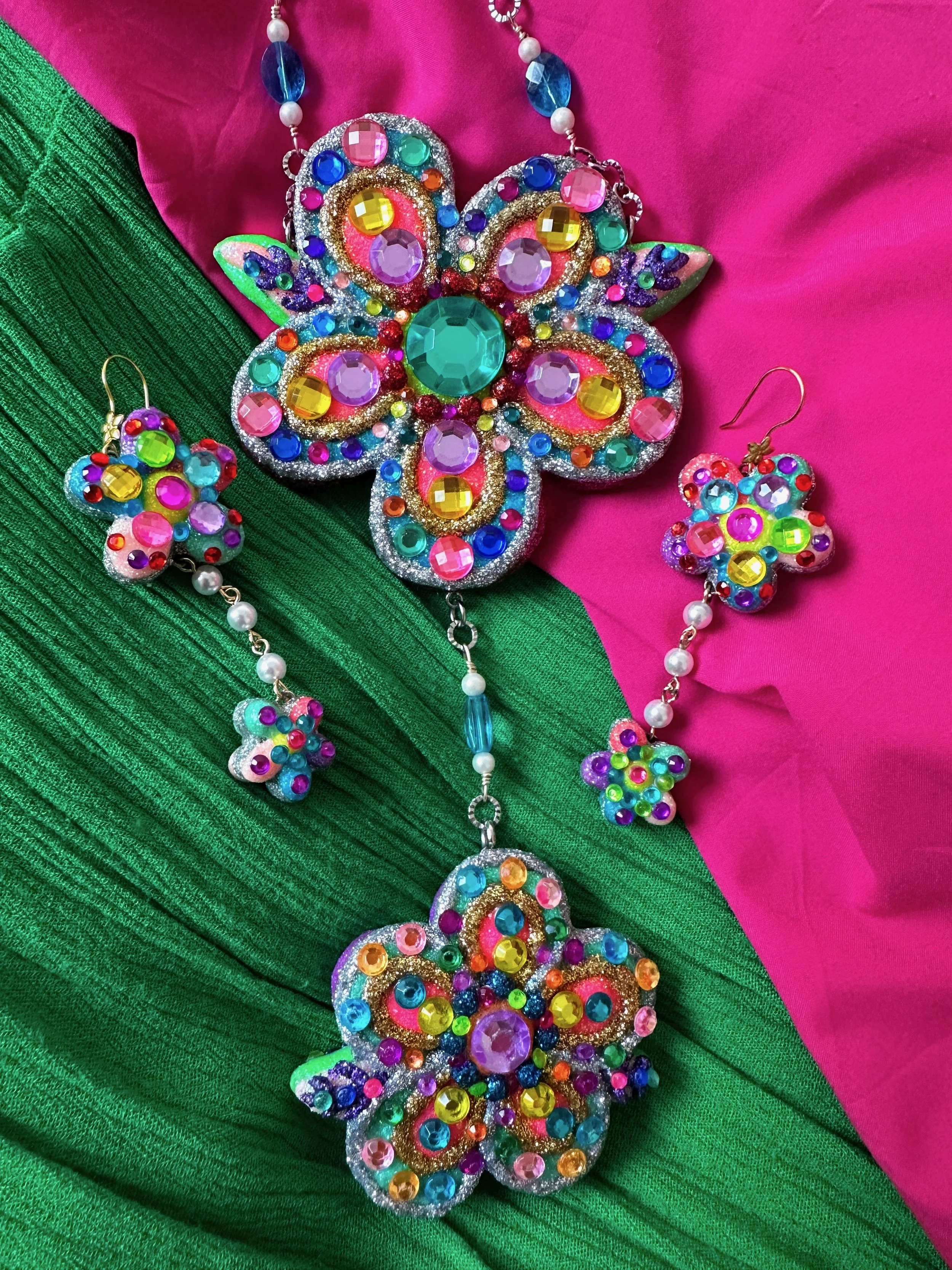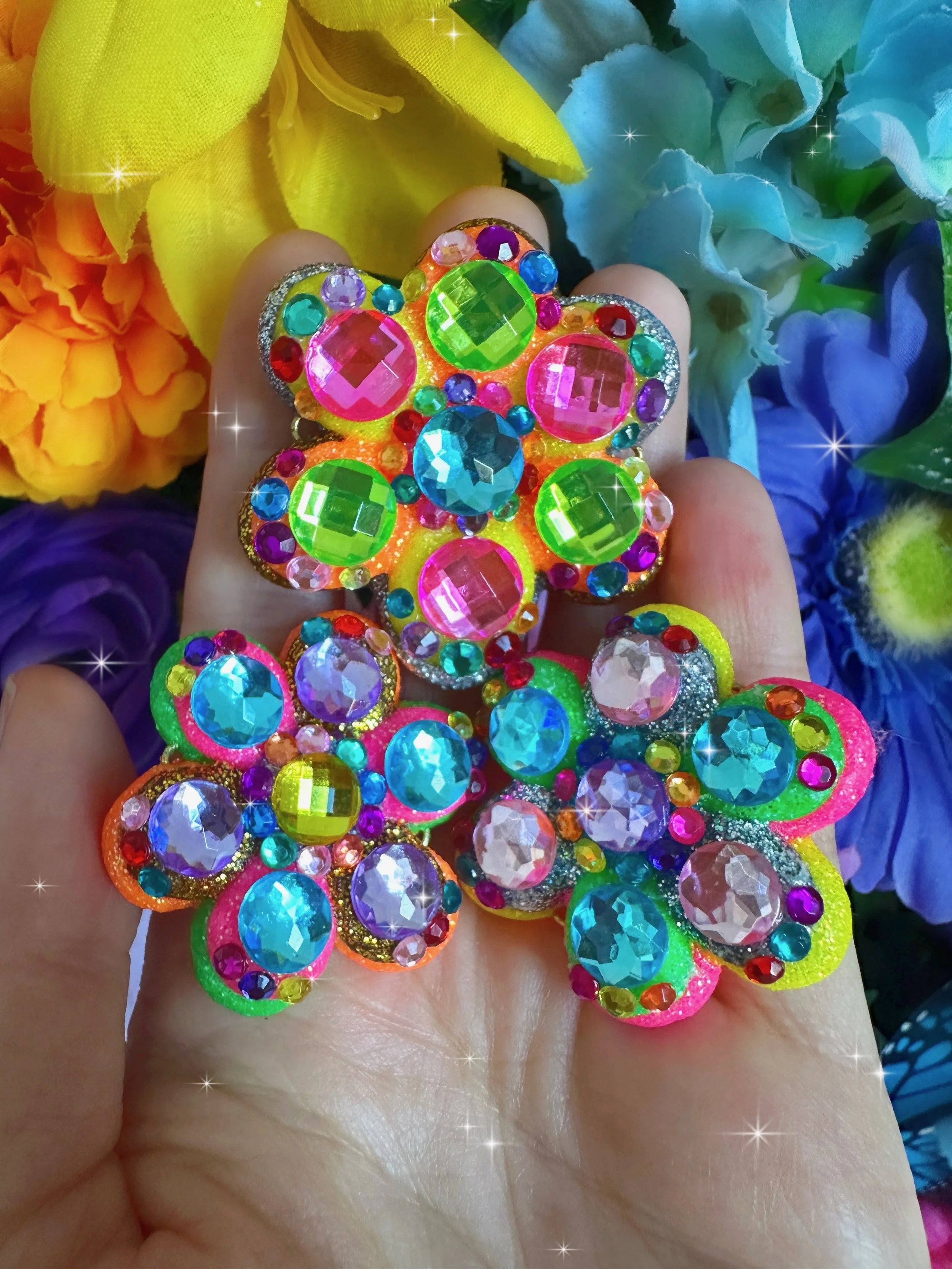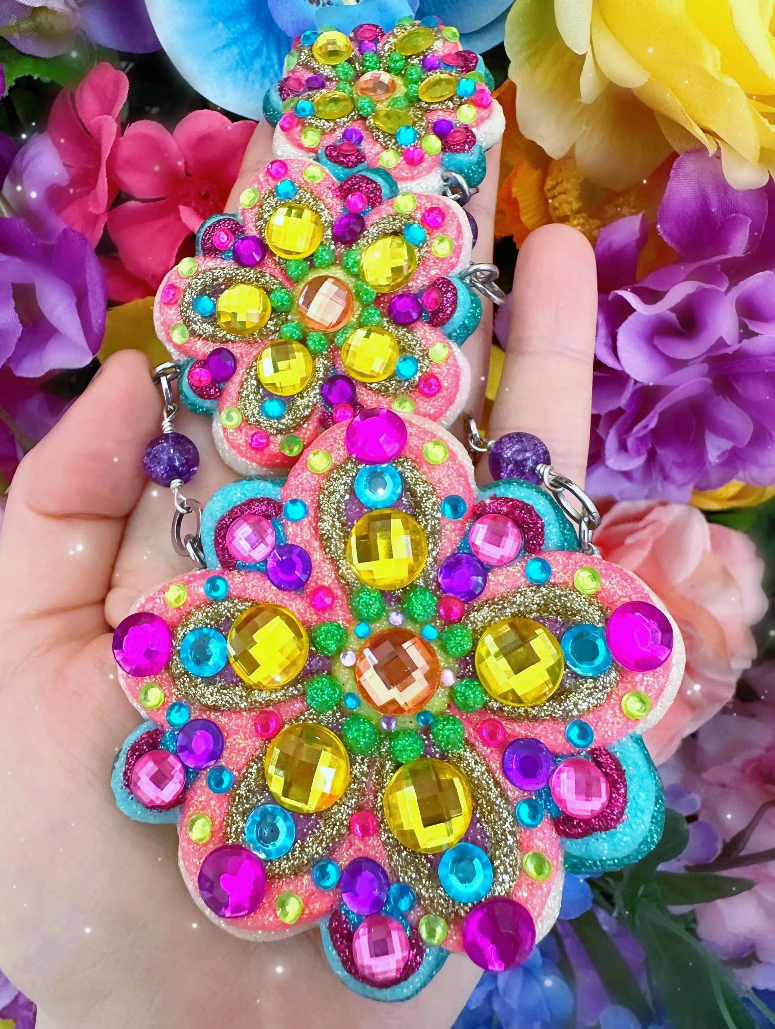 Glistening new flower necklaces and earrings are ready to adorn you with all the sparkly flower fairy magic! These flowers are full of endless rainbows, glittering fairy dust, the most colorful rhinestones and shimmering crystals, gemstones and pearls to brighten up your day and keep you sparkling everywhere you go! I hope these flowers bring you lots of joy and sunshine and remind you how bright and sparkly you truly are!