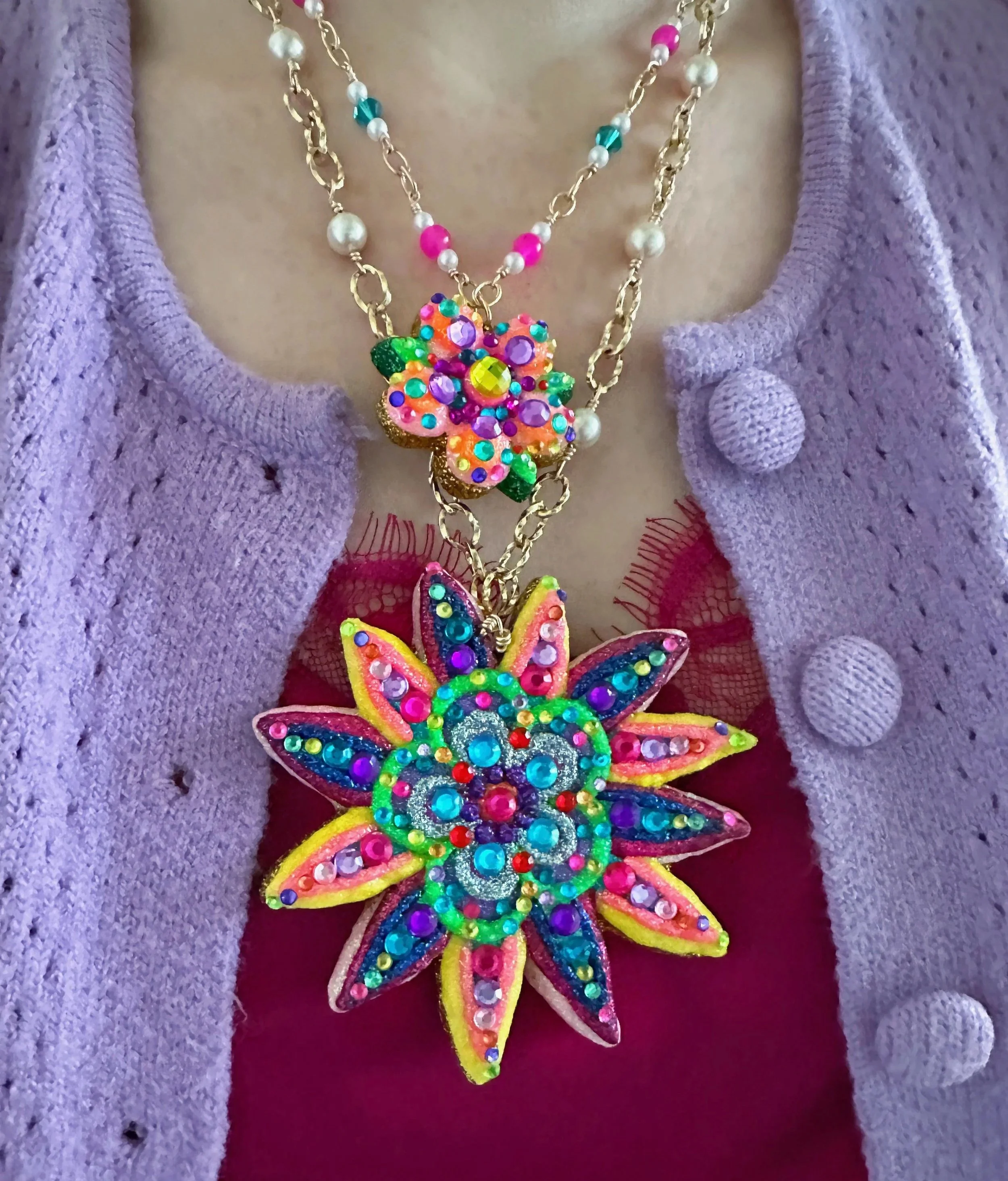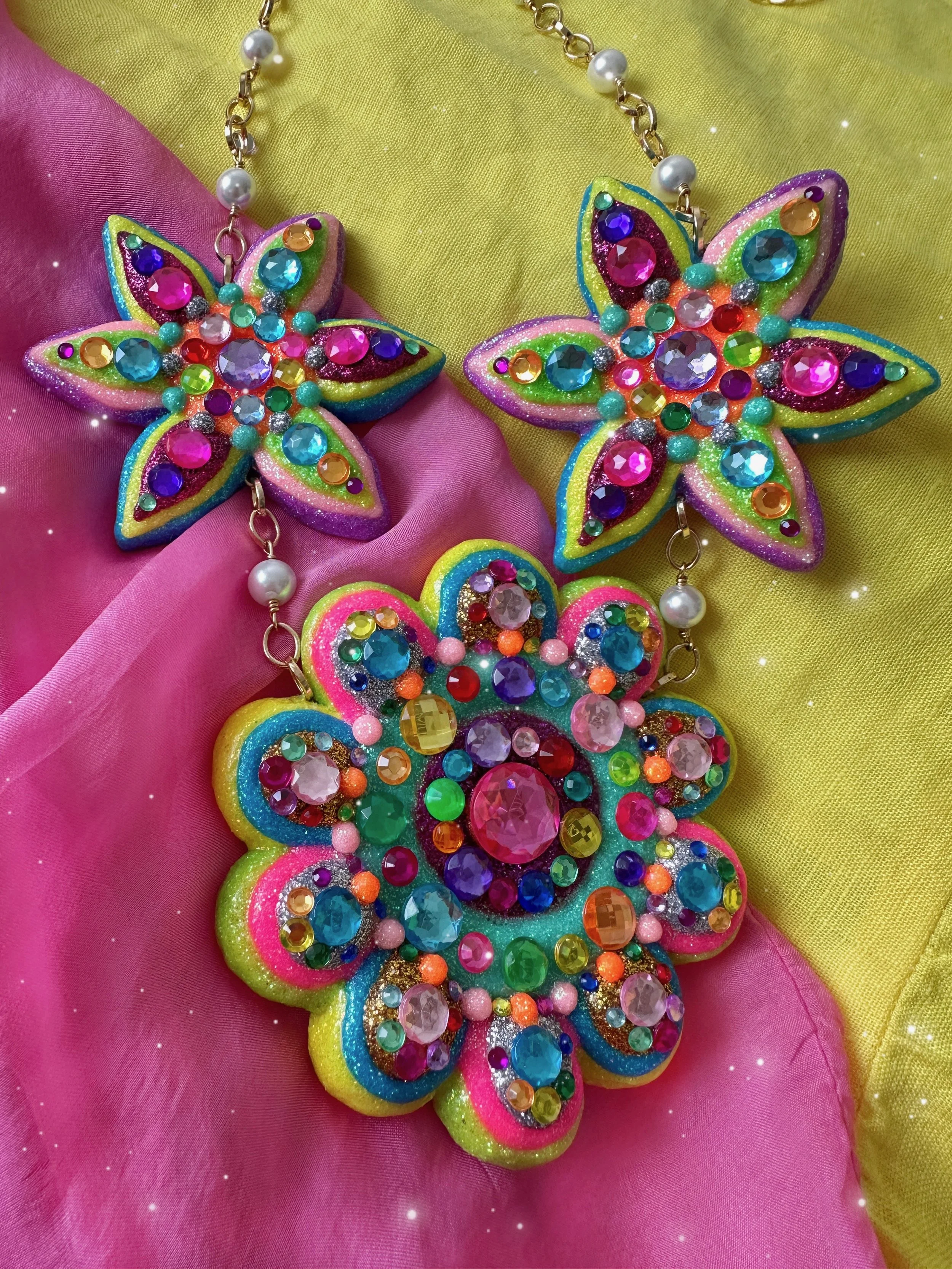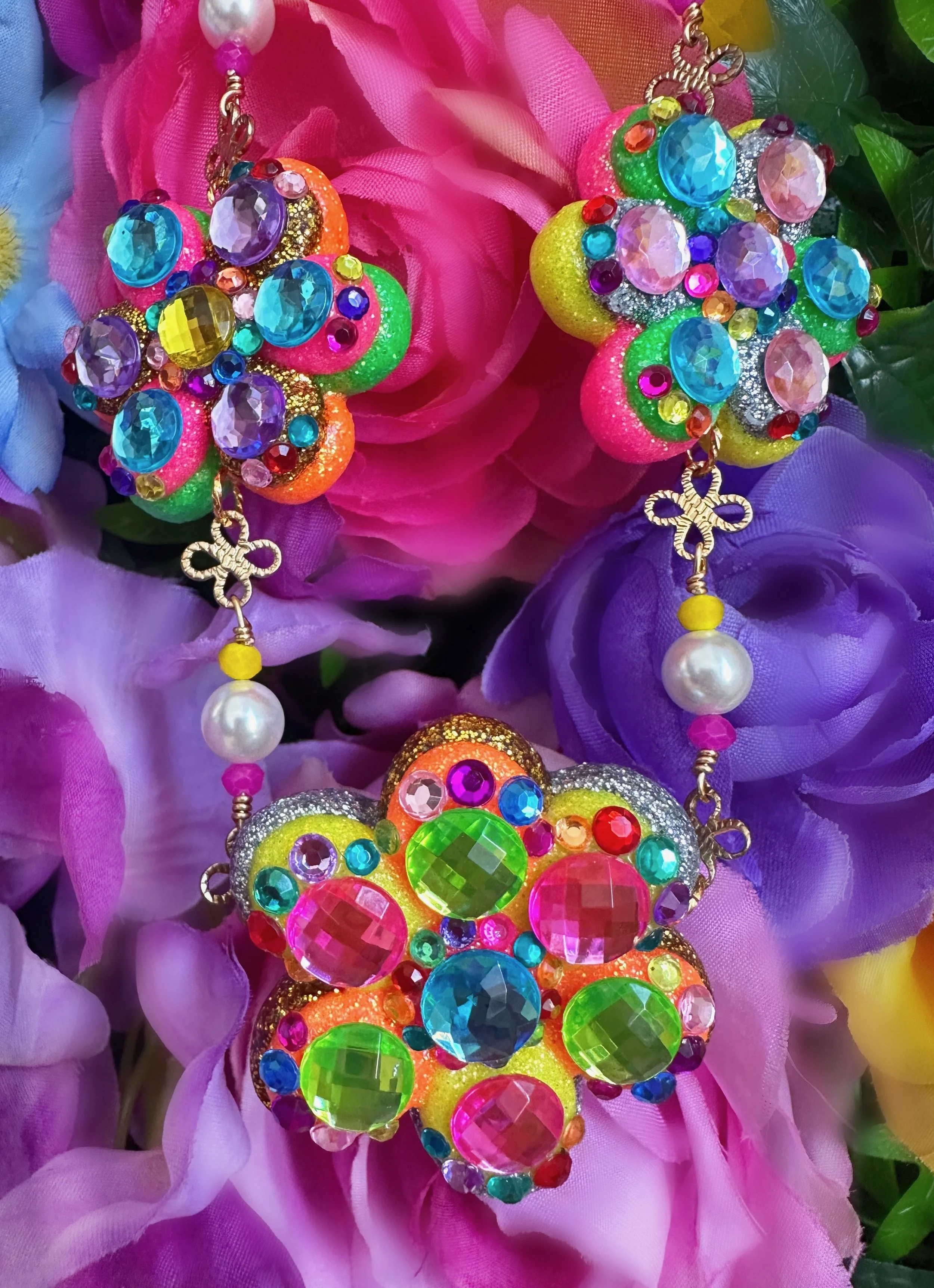 Once upon a time in my enchanted garden, three magical flowers burst into bloom to remedy the greyest days. Each one was shimmering and shining endlessly with glistening fairy dust in beautiful glimmers of neon with touches of glittering silver and gold, every petal dancing with sparkling rhinestones in all the colors of the rainbow. These magical flowers blossomed upon a beautiful golden stem with huge white pearls, the whole necklace sparkling in the sunlight, casting a fairytale glow around the whole garden and bringing sunshine to the lucky flower fairy queen that will pick these blooms!