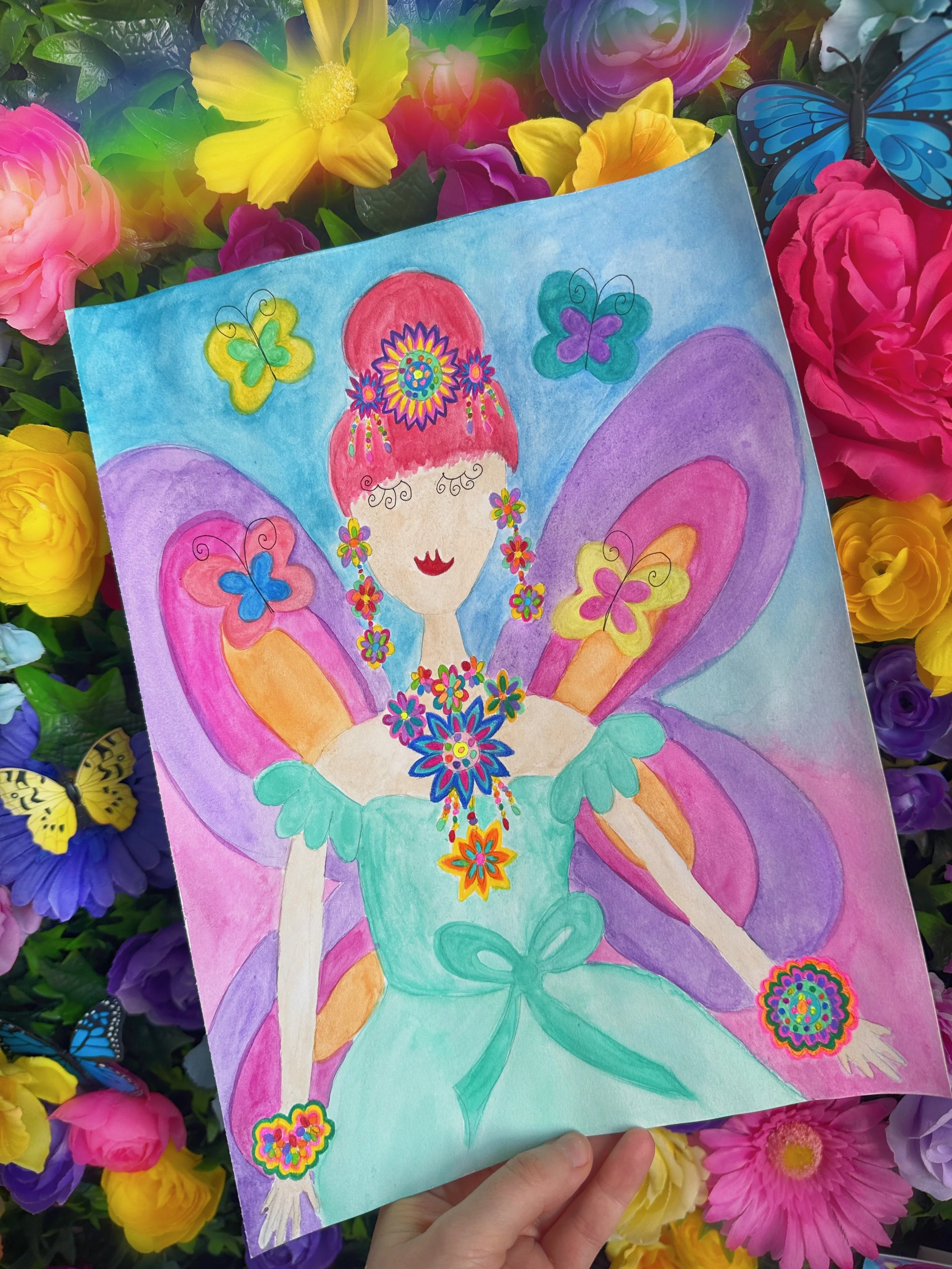 Once upon a time in my enchanted garden, beautiful petals of glittering pink, rose and magenta began to unfurl, each one brighter than the last with sparkling dewdrops in every color of the rainbow and shimmers of gold, turquoise and bright blue. This magical flower blossomed around a beautiful rainbow center, shining and glistening as butterflies danced across it. And the stem of this majestic flower was of shining silver, complete with coral and blue crystals and pearls, just waiting for a flower fairy queen to pick it and adorn herself…