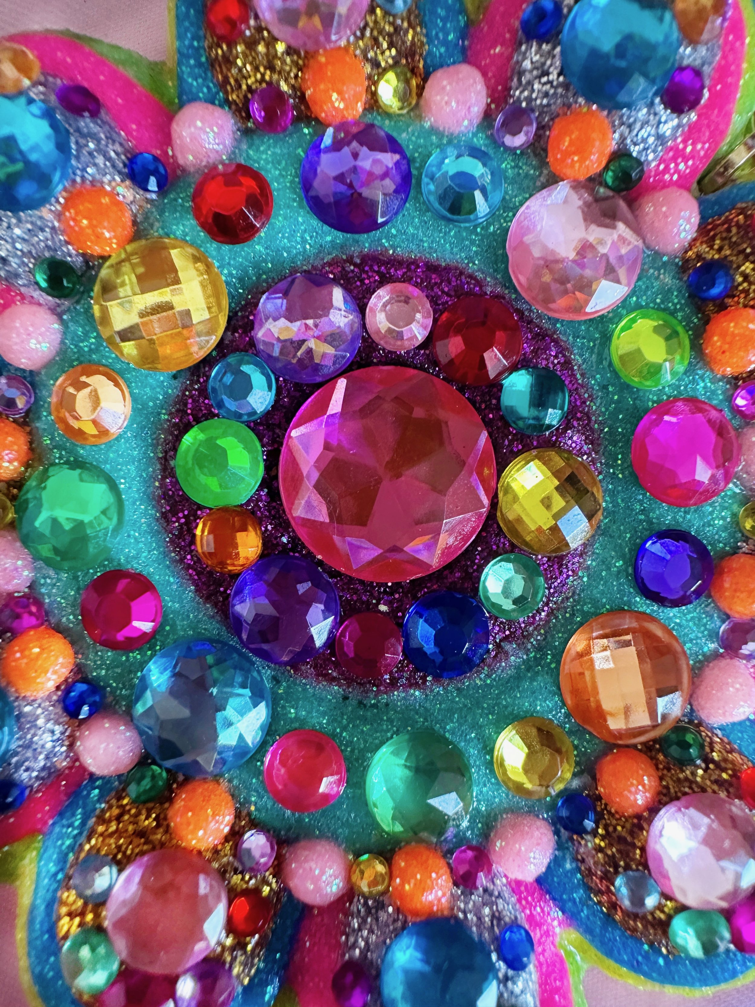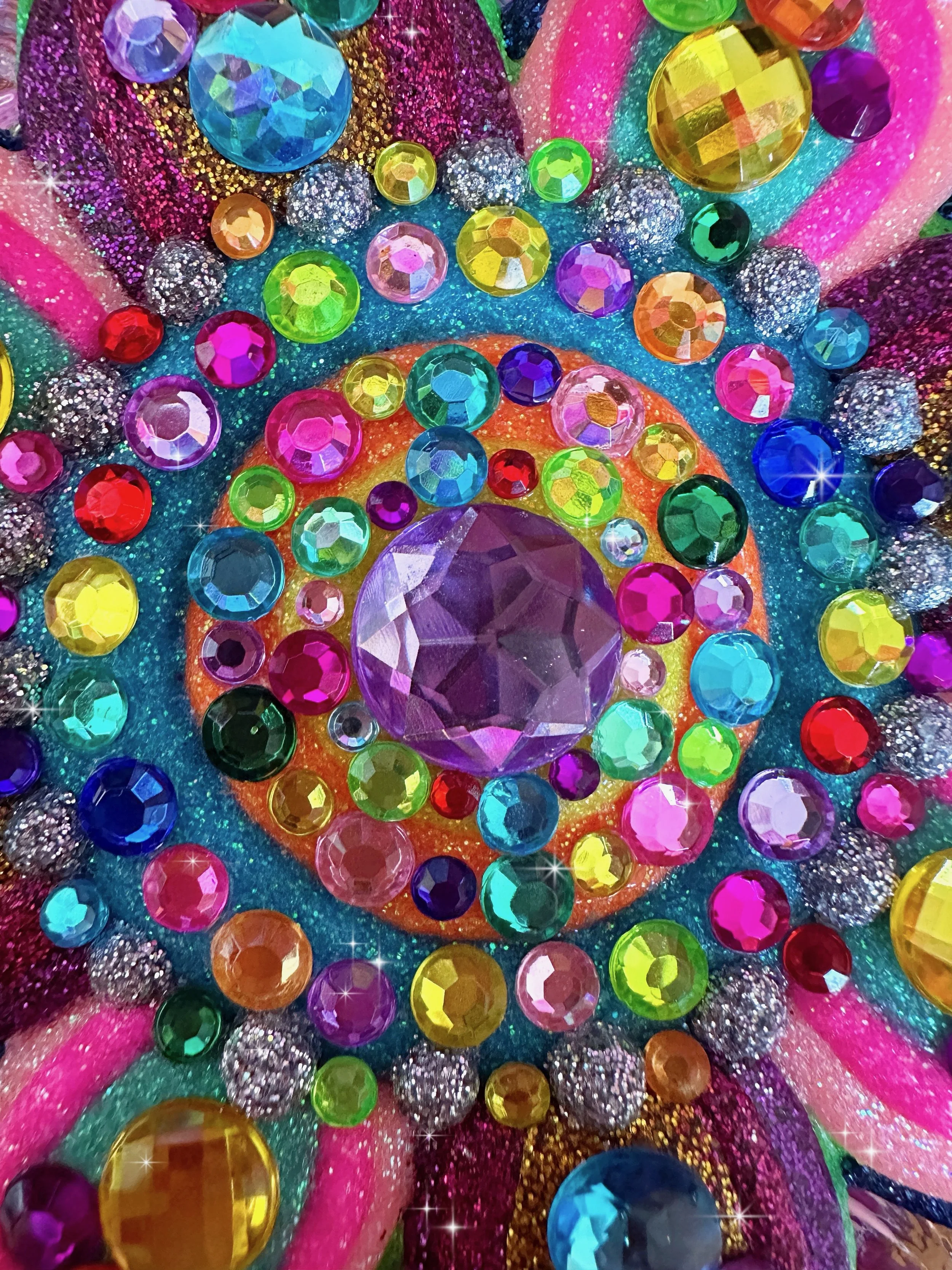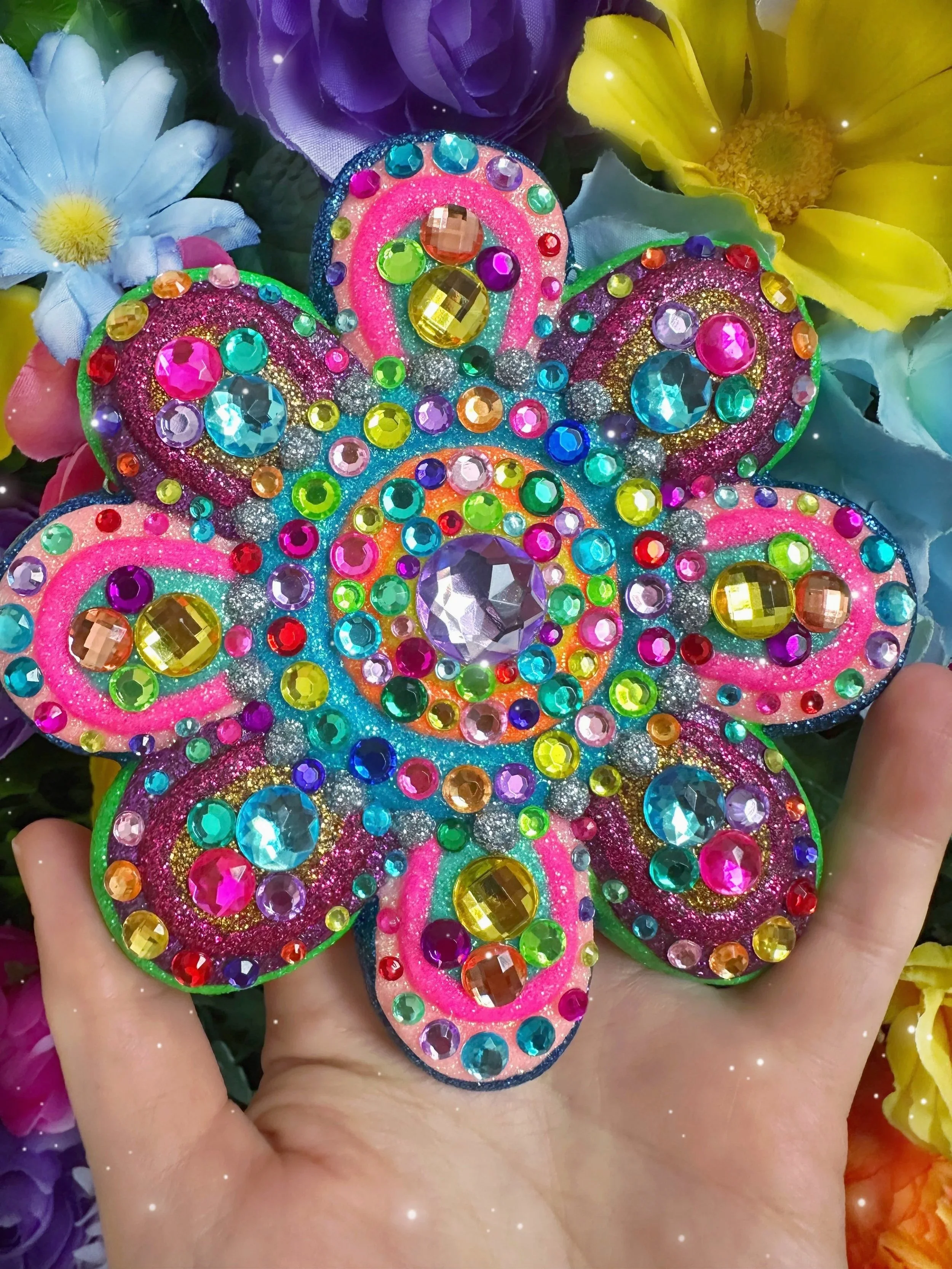 Once upon a time in my enchanted garden, sparkling flowers blossomed to brighten up the morning with their vibrant petals of shimmering purple and green fairy dust, edges dipped in glistening gold. Each petal shone with an enormous rhinestone, all in different colors, to bring you all the happiness and joy on even the cloudiest days. These magical flowers danced and sparkled in the breeze, adorned with turquoise crystals and pearls, perfect for a flower fairy queen!