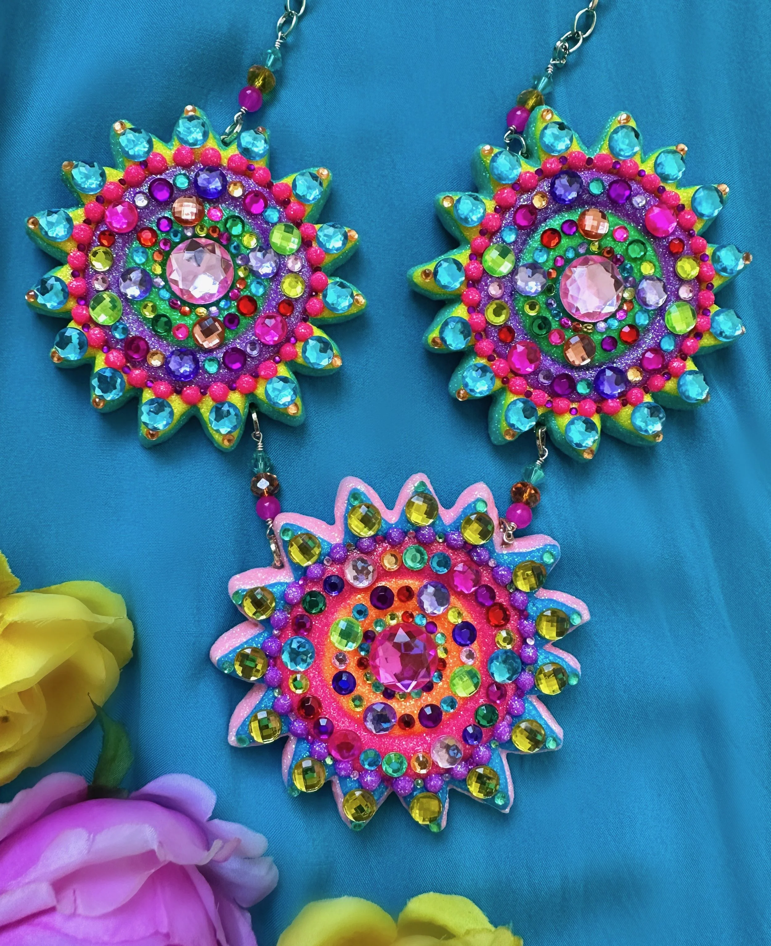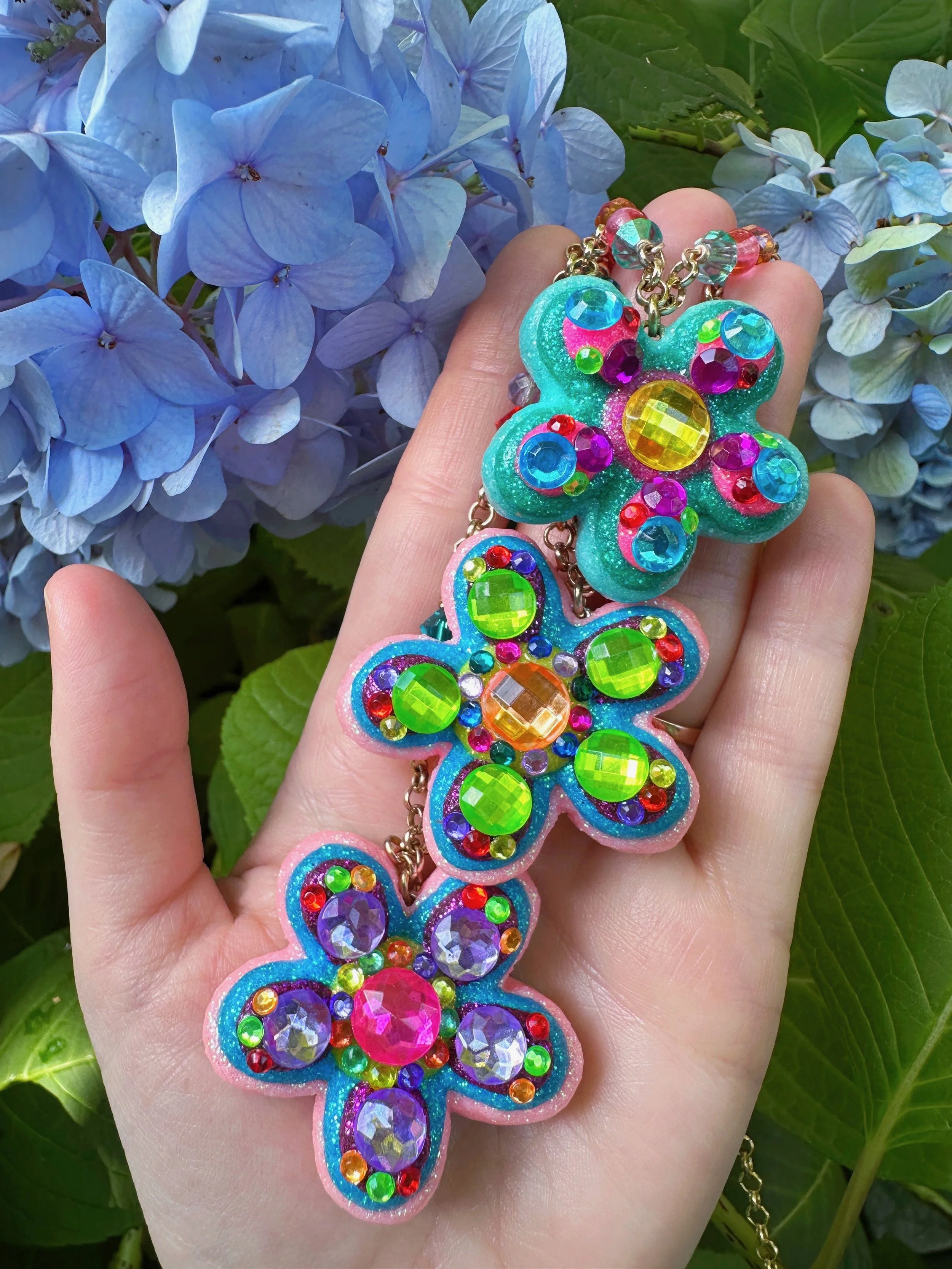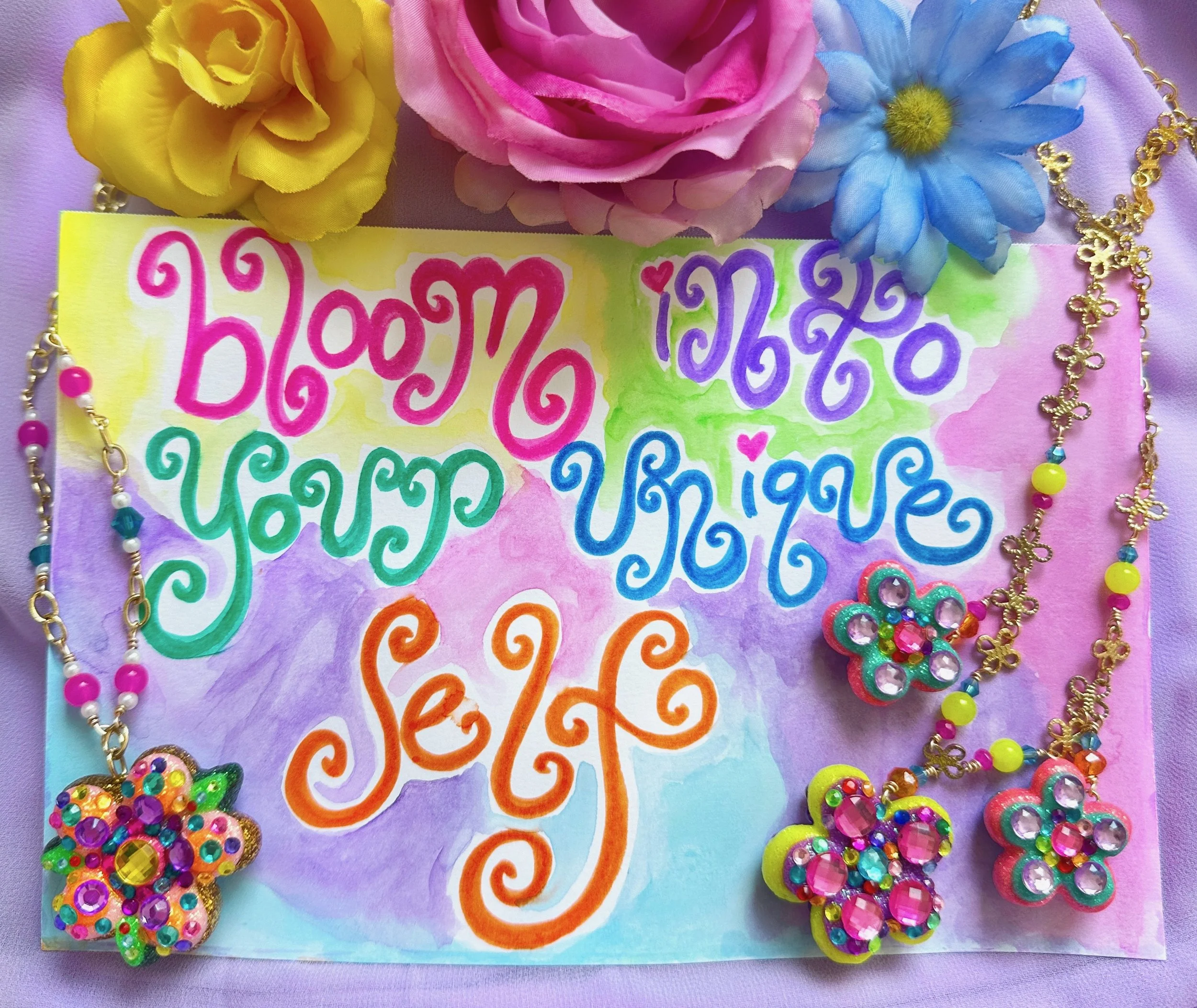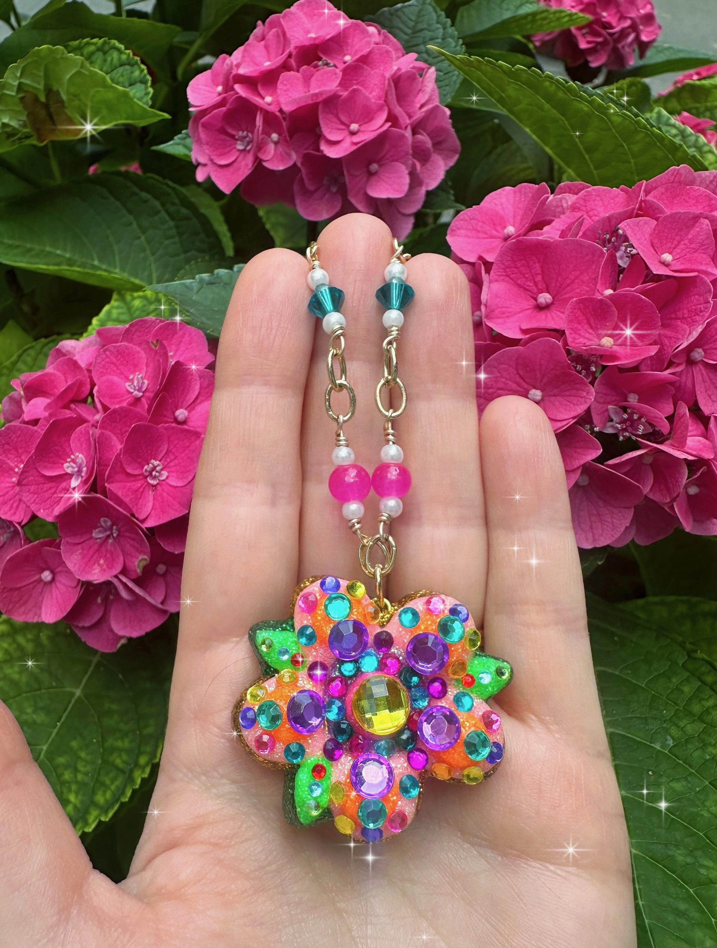 I’ve been taking all of this happy, wonderful, colorful summertime flower inspiration back with me to my own enchanted garden to grow magical new flowers…I’ve been sculpting each petal and then painting them with layer upon layer of the brightest, happiest glitter before adorning each one with lots of rhinestones…then each flower blooms upon a beautiful golden stem (aka the necklace chain!) with lots of crystals, gemstones and pearls for even more color and joy (and so you can pick and wear each magical blossom!)…