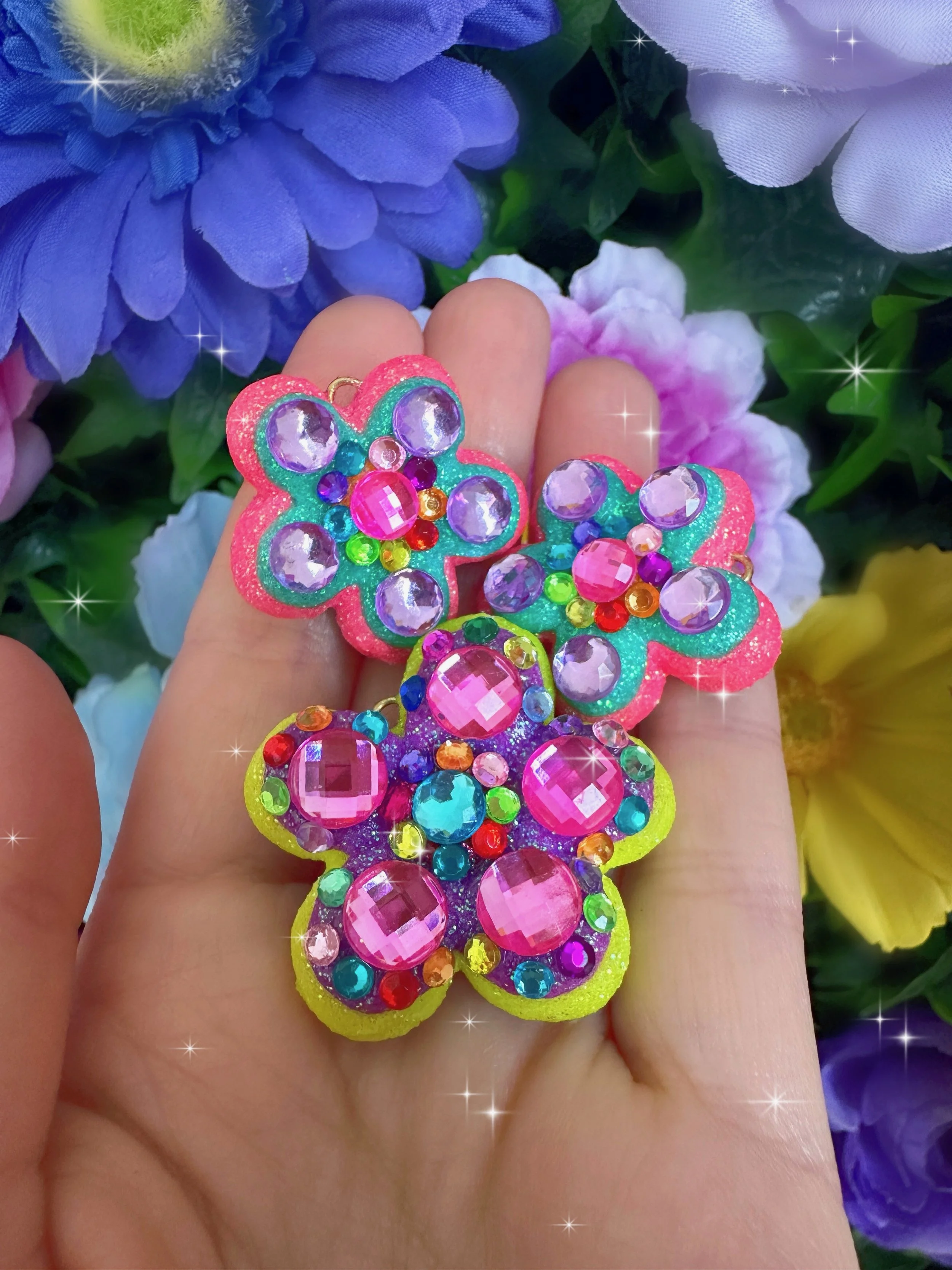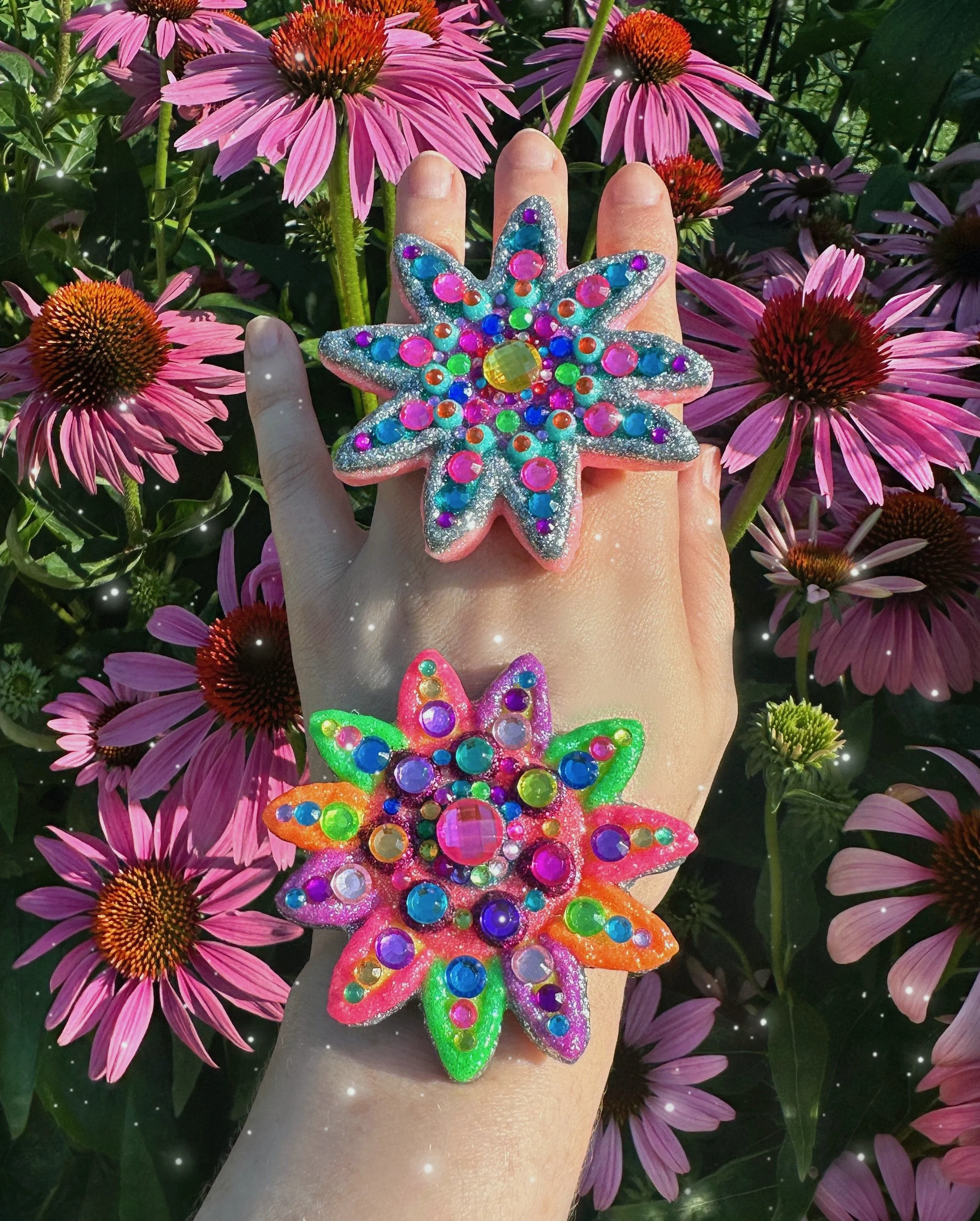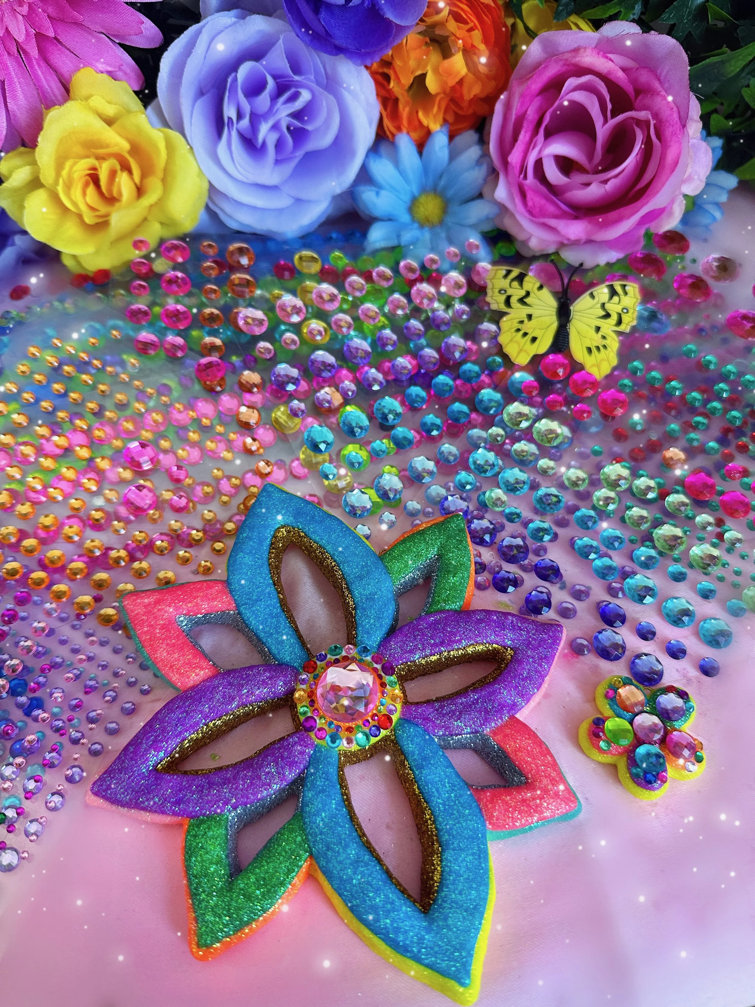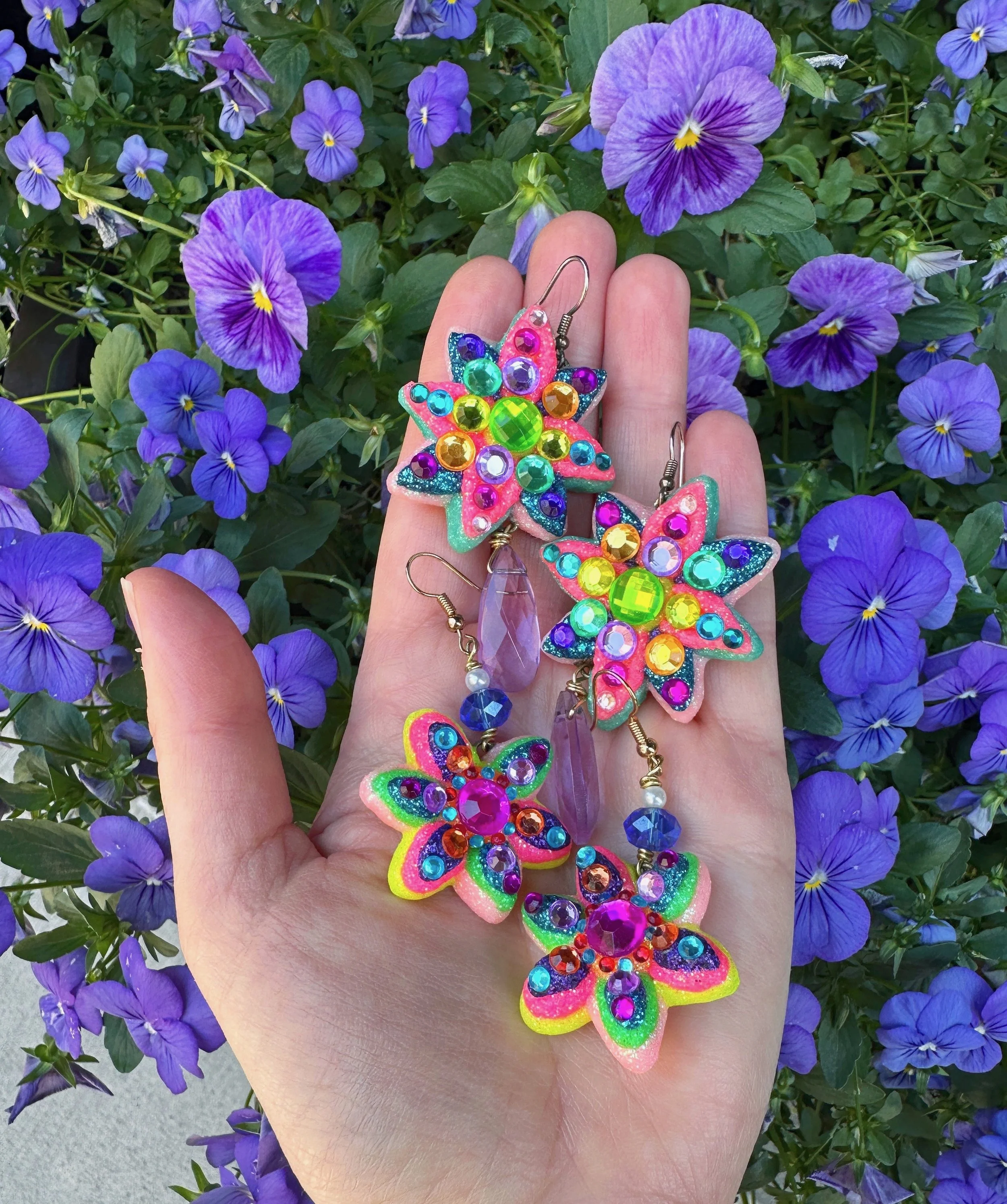 I’ve been taking all of this happy, wonderful, colorful summertime flower inspiration back with me to my own enchanted garden to grow magical new flowers…I’ve been sculpting each petal and then painting them with layer upon layer of the brightest, happiest glitter before adorning each one with lots of rhinestones…then each flower blooms upon a beautiful golden stem (aka the necklace chain!) with lots of crystals, gemstones and pearls for even more color and joy (and so you can pick and wear each magical blossom!)…