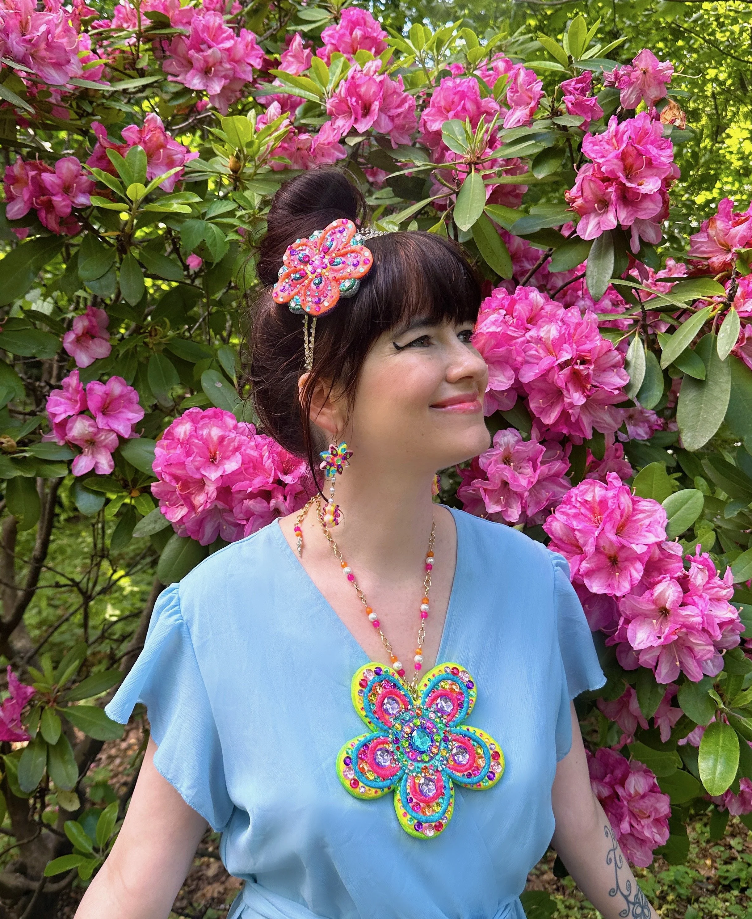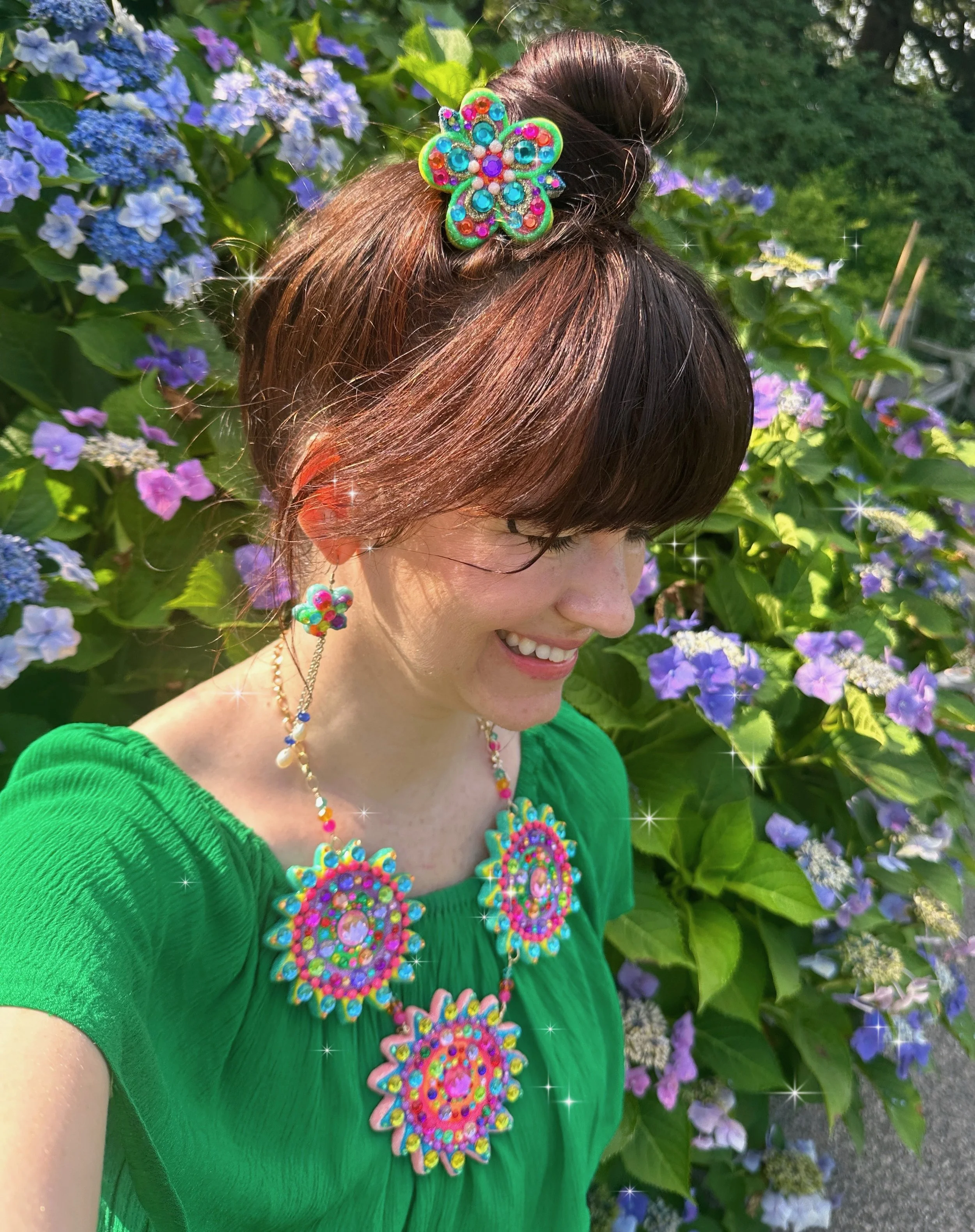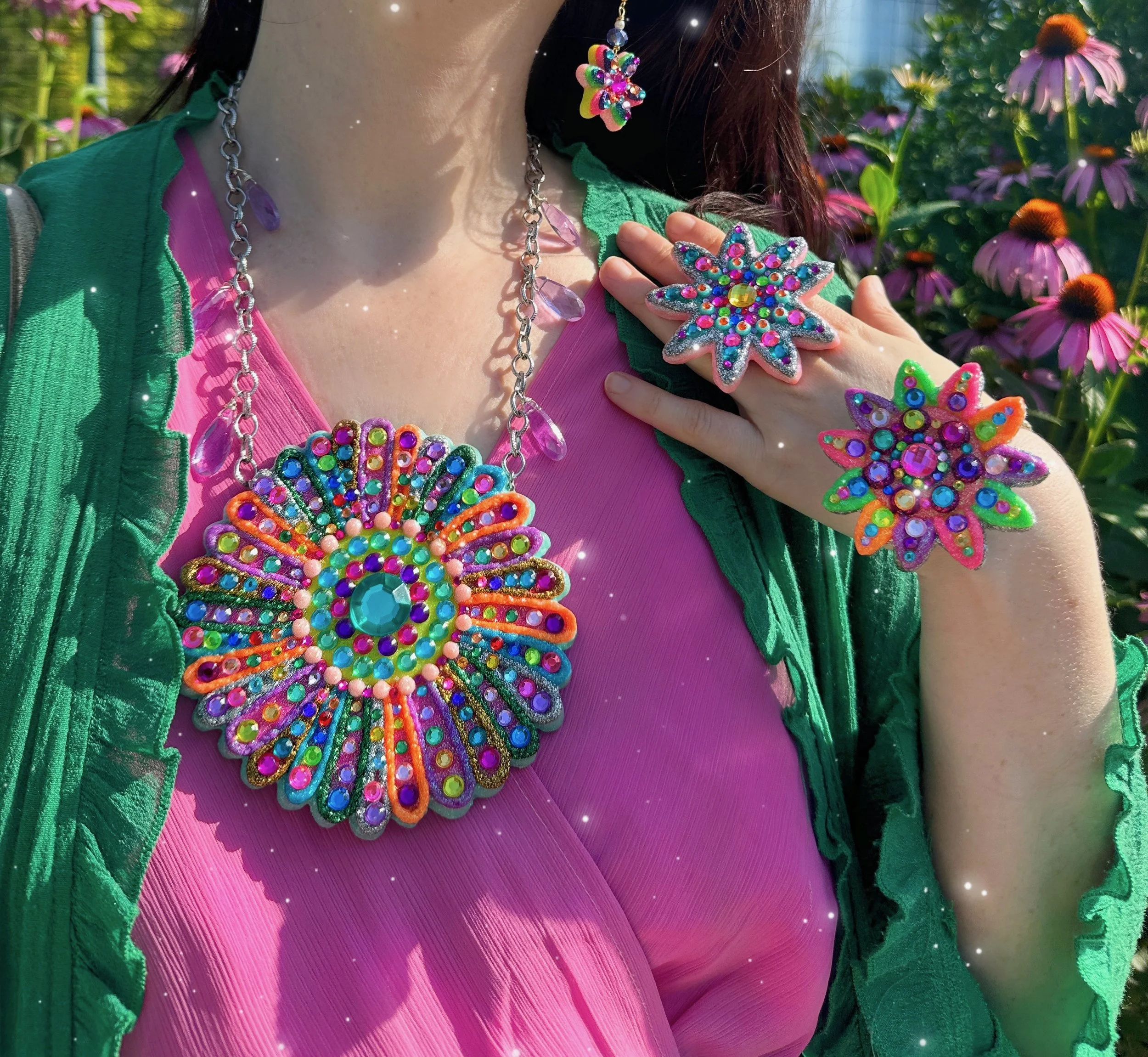 Here’s a little peek at some of these necklaces in full bloom with all of their rainbow hues…including a huge new flower necklace that’s almost as big as those pink hibiscus and a super magical, sparkling necklace blossoming with three of the most colorful sunflowers! Because sometimes you just need an enormous flower (or flowers!) to brighten up your day. There is also a shimmering necklace full of lots of tiny blooms, for when you want something more delicate that is still so bold and bright, just like the happiest summer blooms!