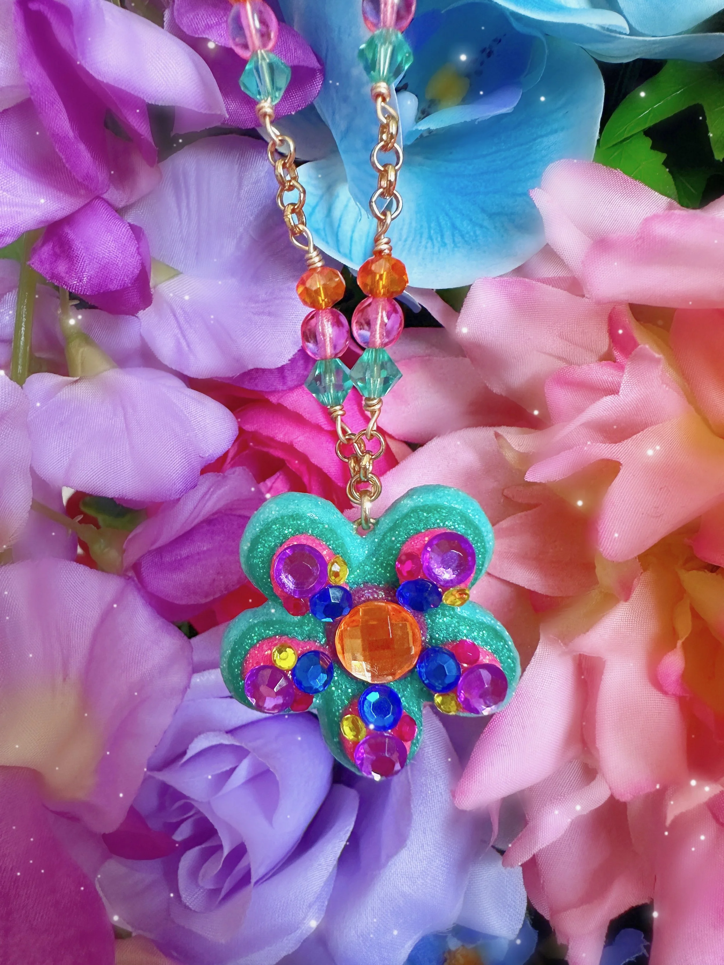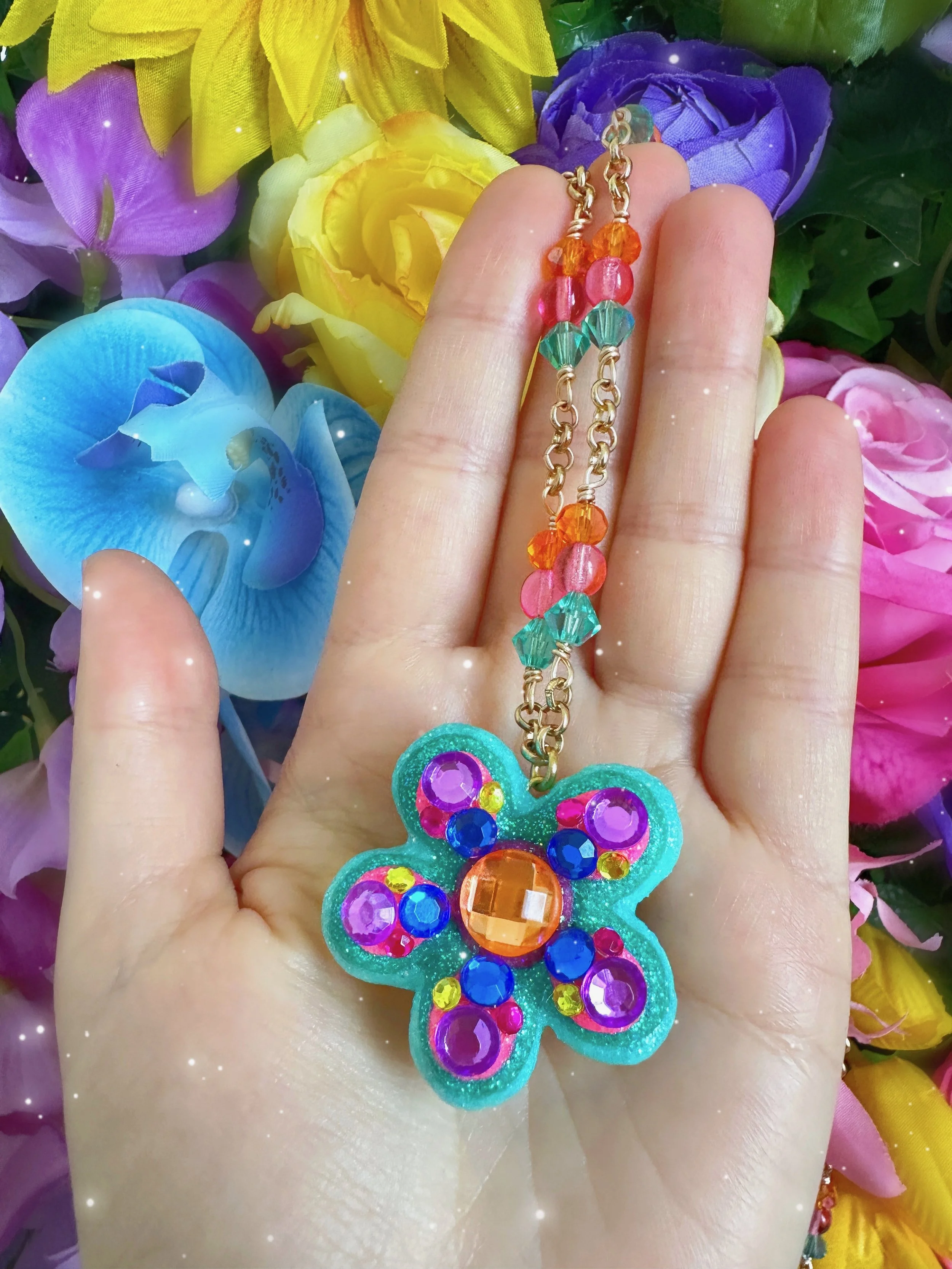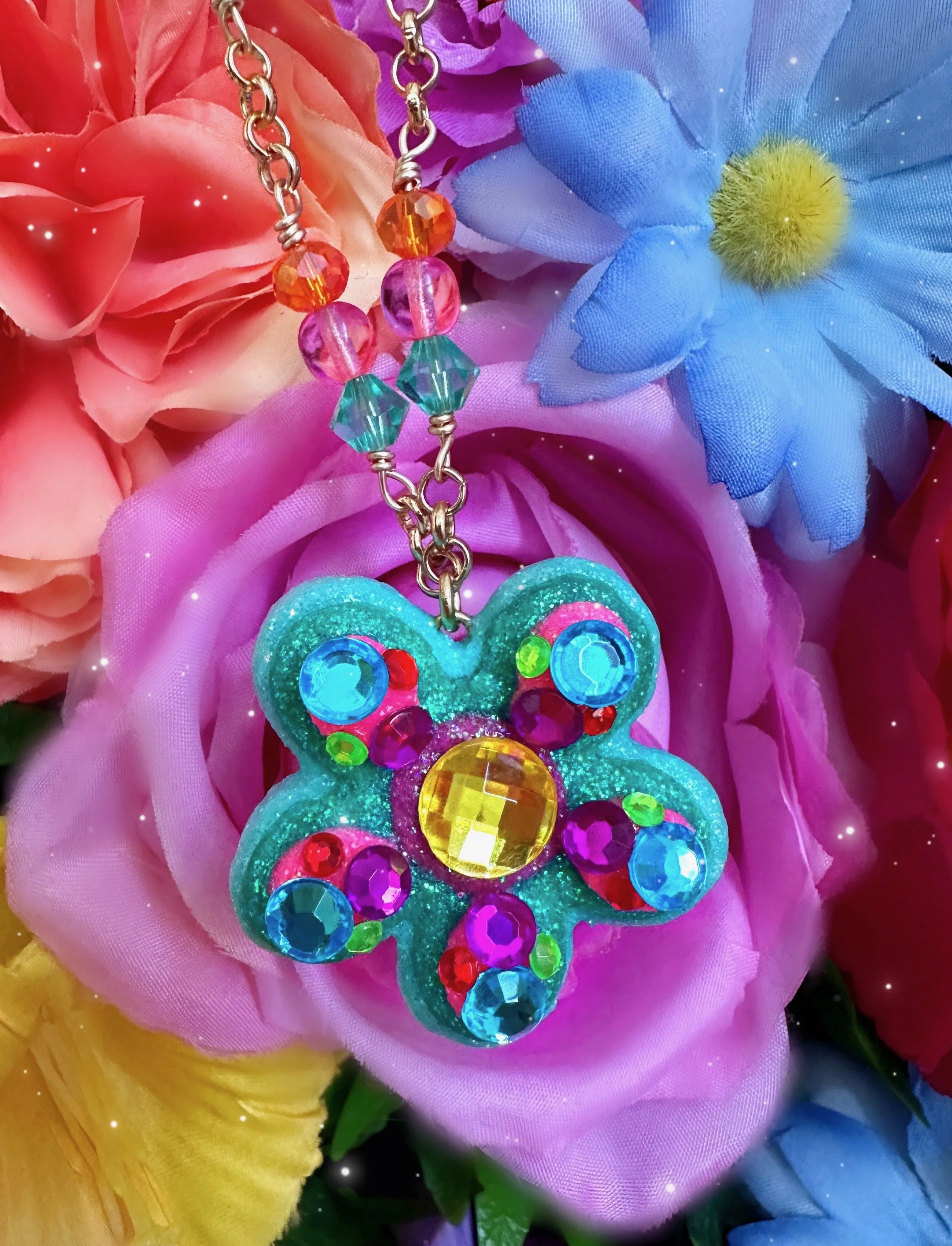 This magical flower is blooming on both sides with beautiful glitter and different colors of rhinestones ~ it can be worn on either side, so it’s like two necklaces in one! (Please see the photos below)