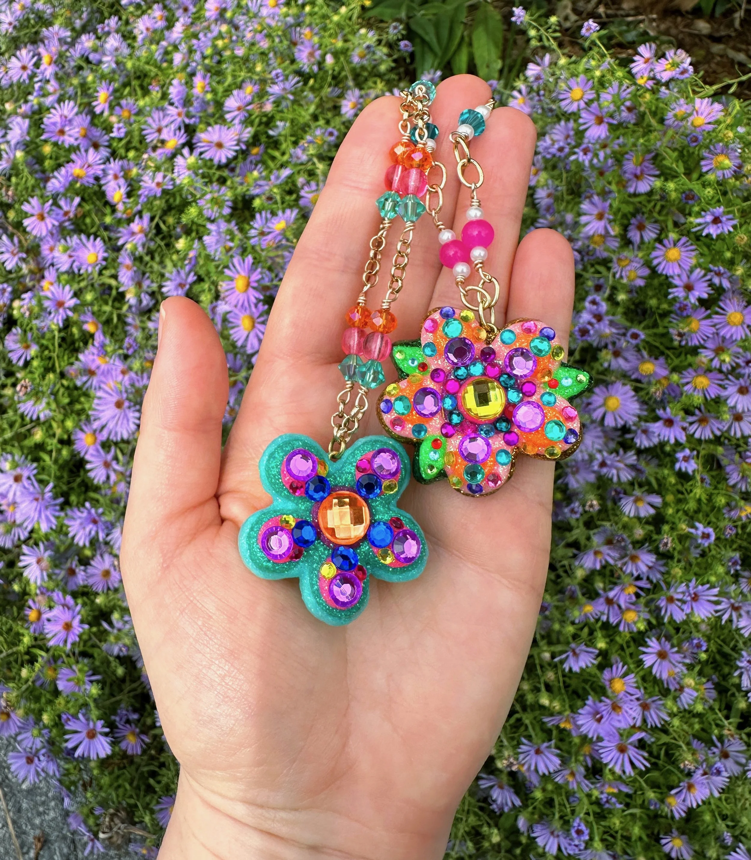 Once upon a time in my enchanted garden, a tiny flower wanted to bloom with all the colors in the world to share so much happiness and joy...and so it blossomed with different colors on each side of its petals, bursting forth with glitter and rhinestones in all of the happiest hues ~ sky blue, turquoise, neon pink, bright purple, sunshine yellow, lavender, orange, royal blue and magenta, so this magical flower would glisten and shine no matter which way it turned!