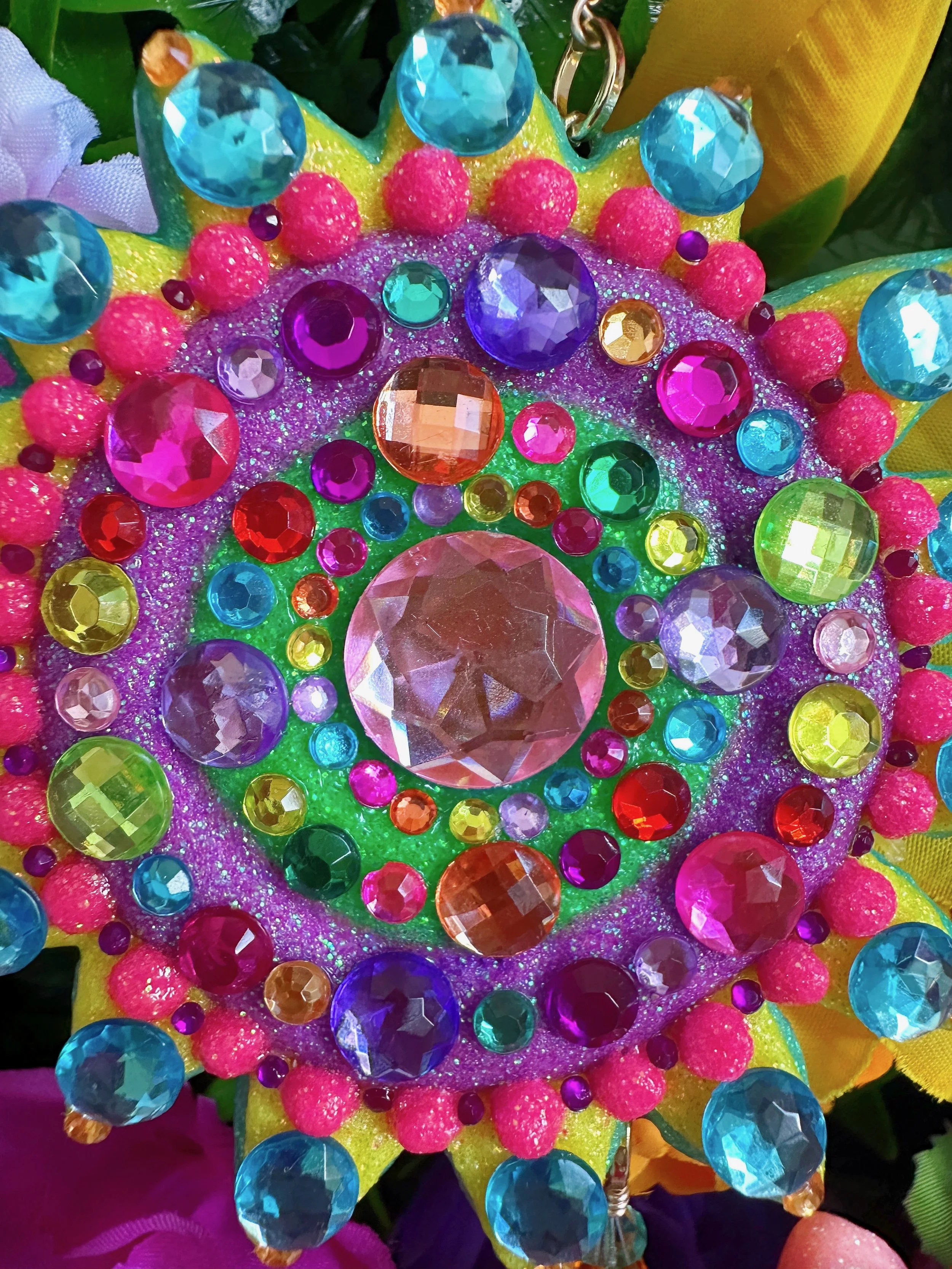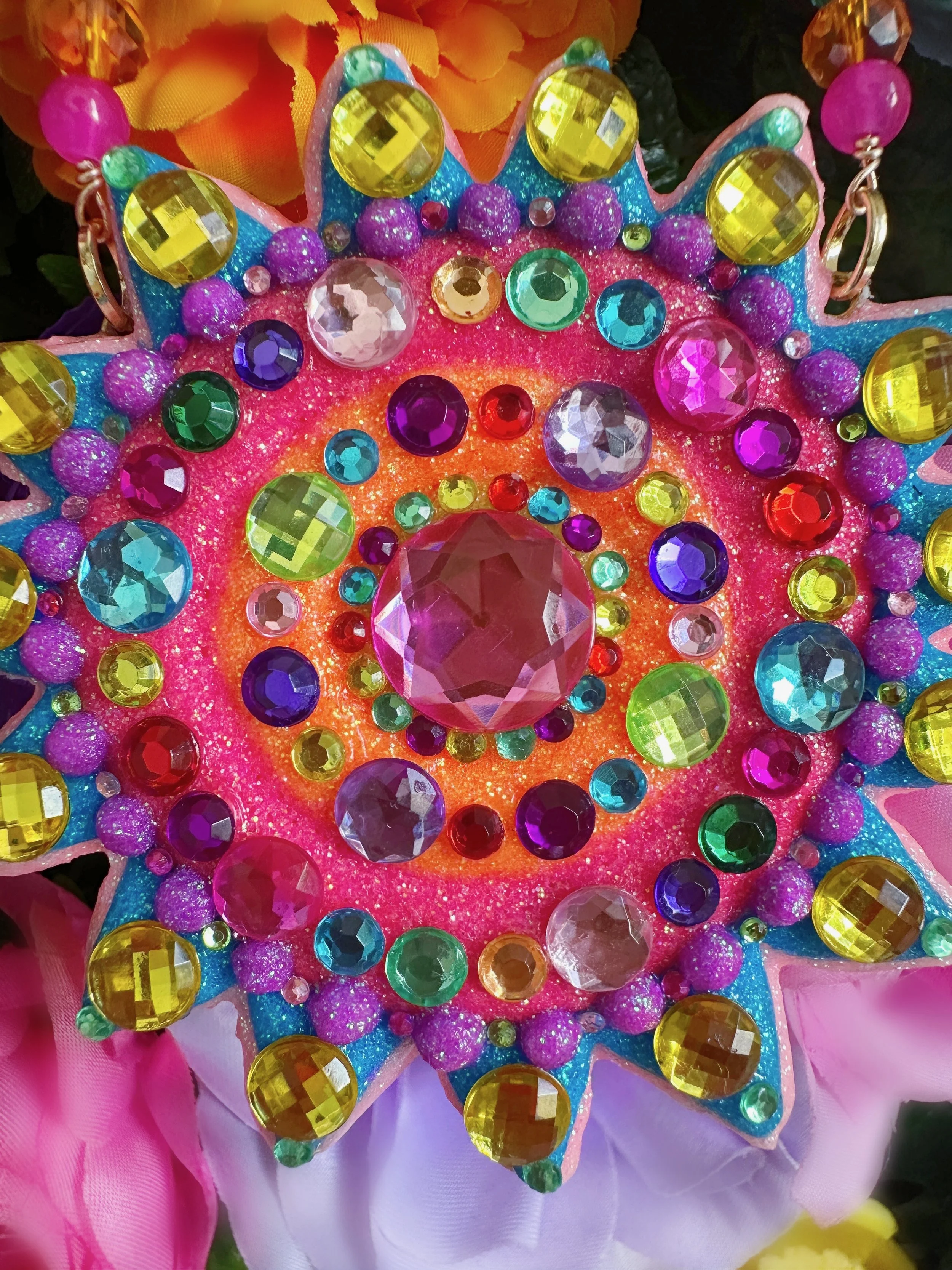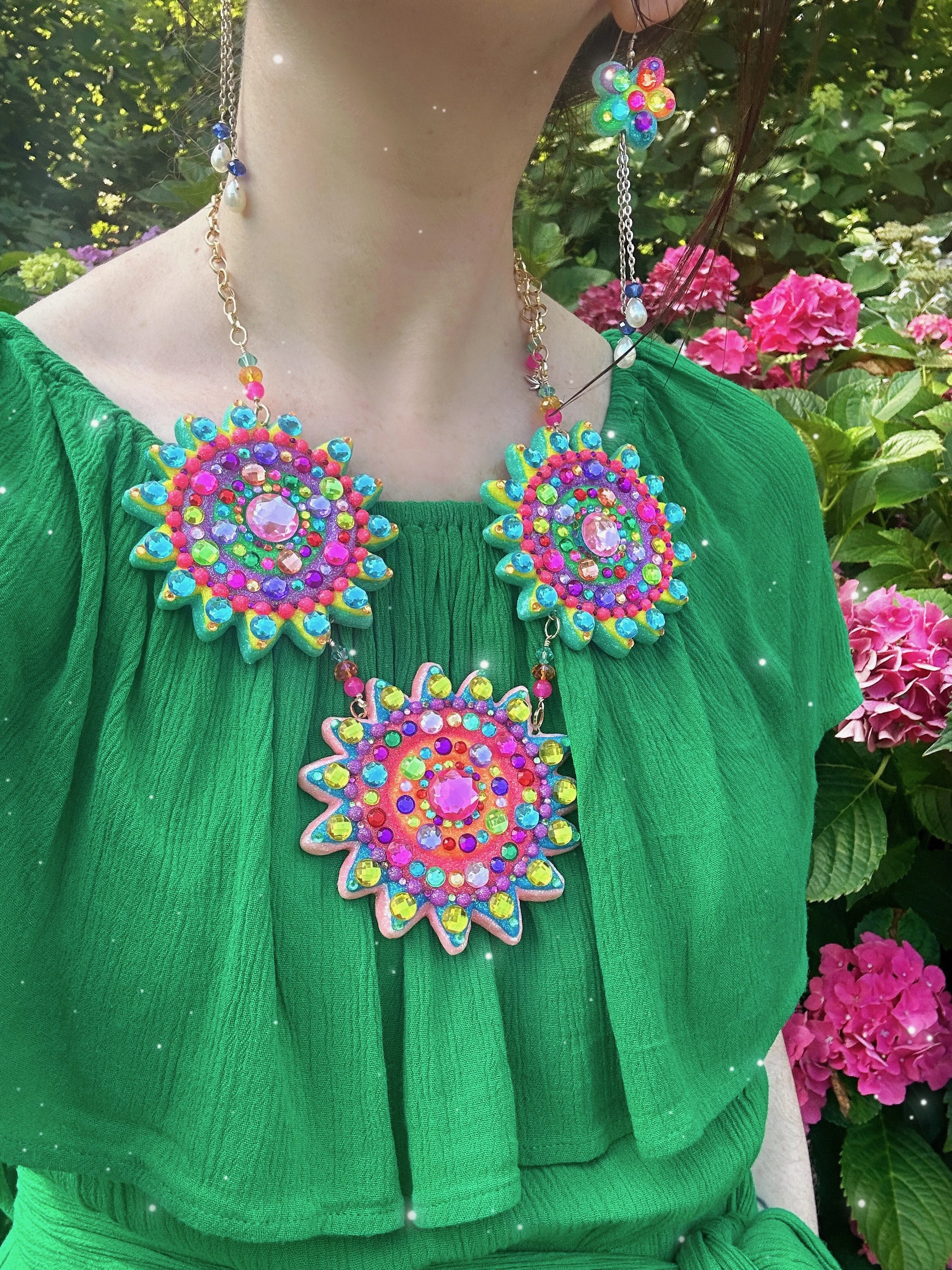 Once upon a time in my enchanted garden, right around the summer solstice, something truly magical happened ~ three glorious sunflowers started blooming, each with more rainbow hues and sparkling glitter and shimmering rhinestones than the last, until three of the most beautiful and vibrant sunflowers were in full bloom upon a golden stem adorned with pink, orange and turquoise crystals…it was the largest necklace that had ever bloomed in my enchanted garden, and it bloomed to inspire you to always be your boldest and most colorful self…