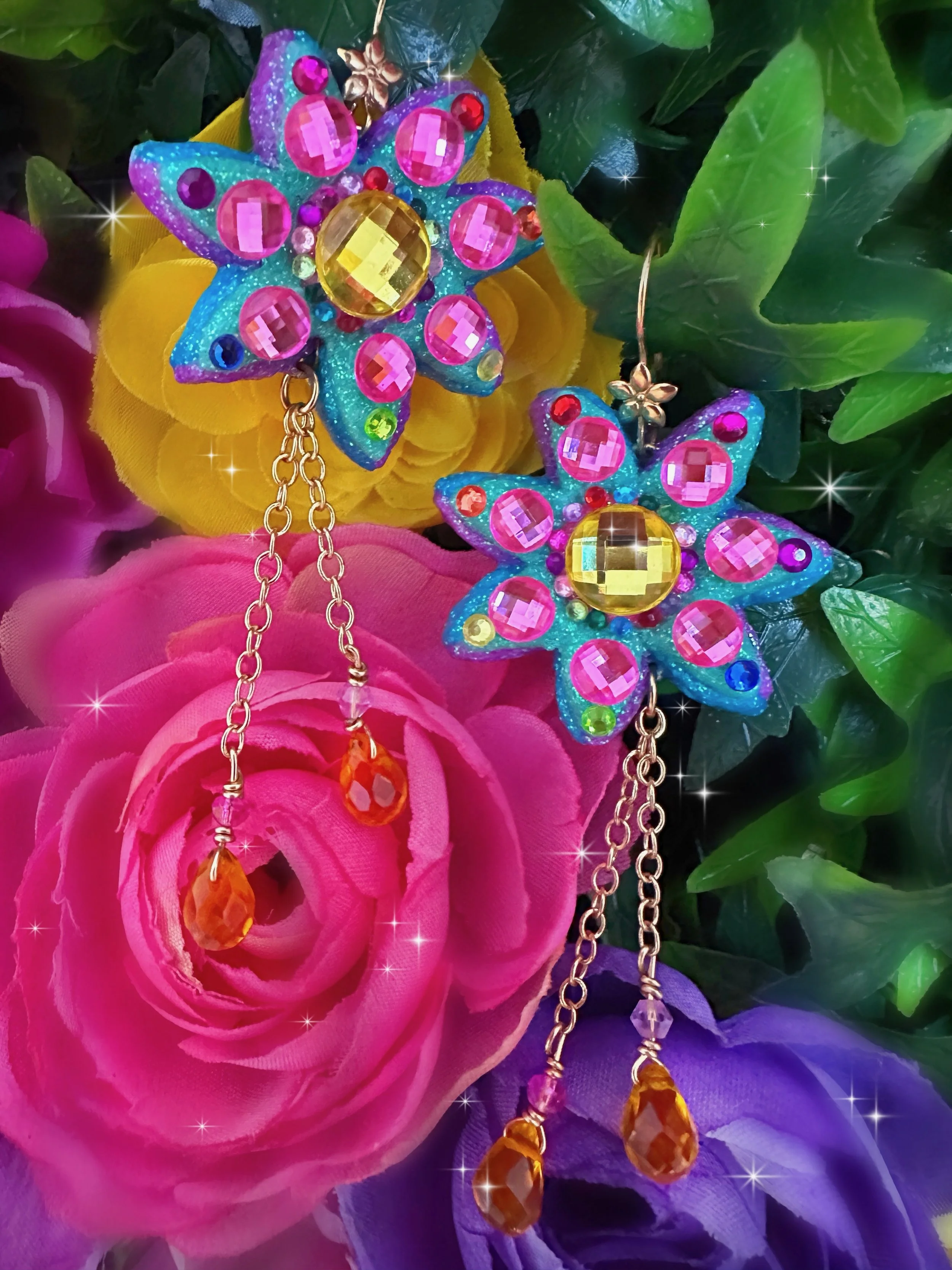 Once upon a time in my enchanted garden, two magical flowers shimmered and glistened like ballerinas dancing in a fairytale. Petals of sky blue and lavender and turquoise sparkled with bright pink rhinestones and magical dewdrops graced each flower with beautiful rainbows. Each bloom shone with cascades of gold and sunshine yellow crystal drops, dancing in the breeze and inspiring the lucky flower fairy who wears them to dance too, all throughout the day, sharing her own magical rainbow self everywhere she goes…